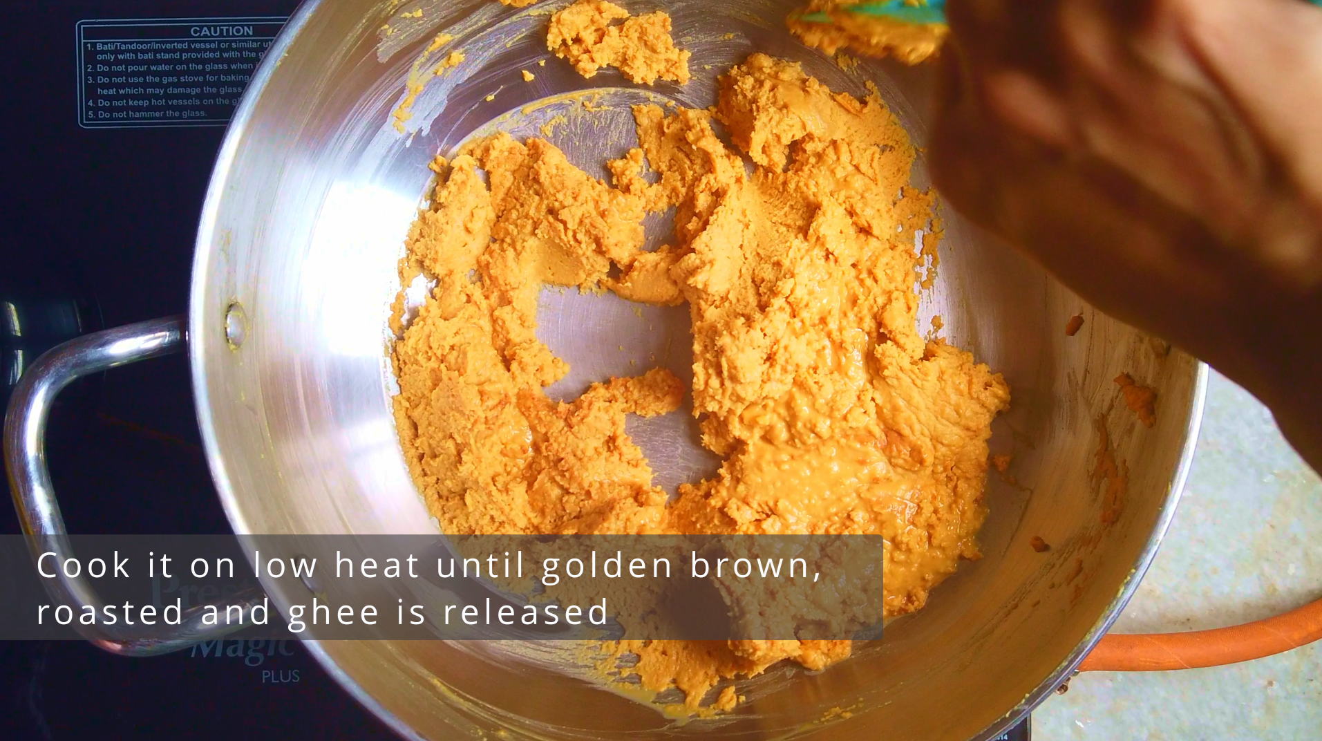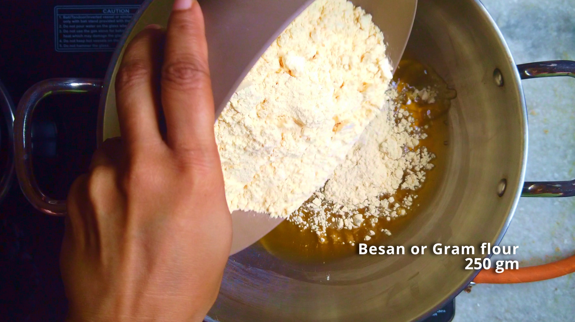 • Always use a heavy kadai or thick-bottomed pan for roasting the besan. This prevents the flour from burning and ensures even cooking. Avoid non-stick pans since the mixture requires constant stirring and might not cook evenly in them.