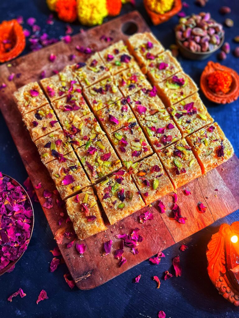 The process begins with slow-roasting besan in ghee until it turns aromatic and golden brown, creating the signature nutty flavour. Once blended with sugar syrup and flavoured with ingredients like cardamom or saffron, the mixture is set into squares or diamonds, resulting in a rich, creamy fudge-like dessert that’s hard to resist.