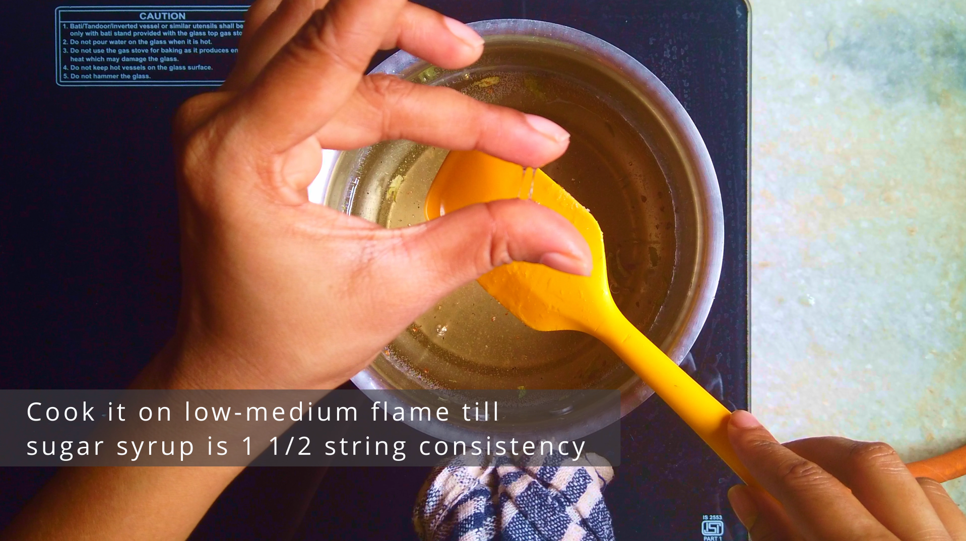 • Step 4: In the meantime combine water, sugar and cardamom powder in a saucepan. Cook on low-medium flame till sugar syrup is 1 1/2 string consistency. To check the syrup consistency, take some sugar syrup on the spatula and allow it to cool for 20-30 seconds, dip your index or middle finger in the syrup and touch it with the thumb, pull your finger and thumb apart. The mixture should form 1 1/2 string, breaking when your fingers reach about 1 cm away from each other. This is a traditional method experienced sweet-makers use.