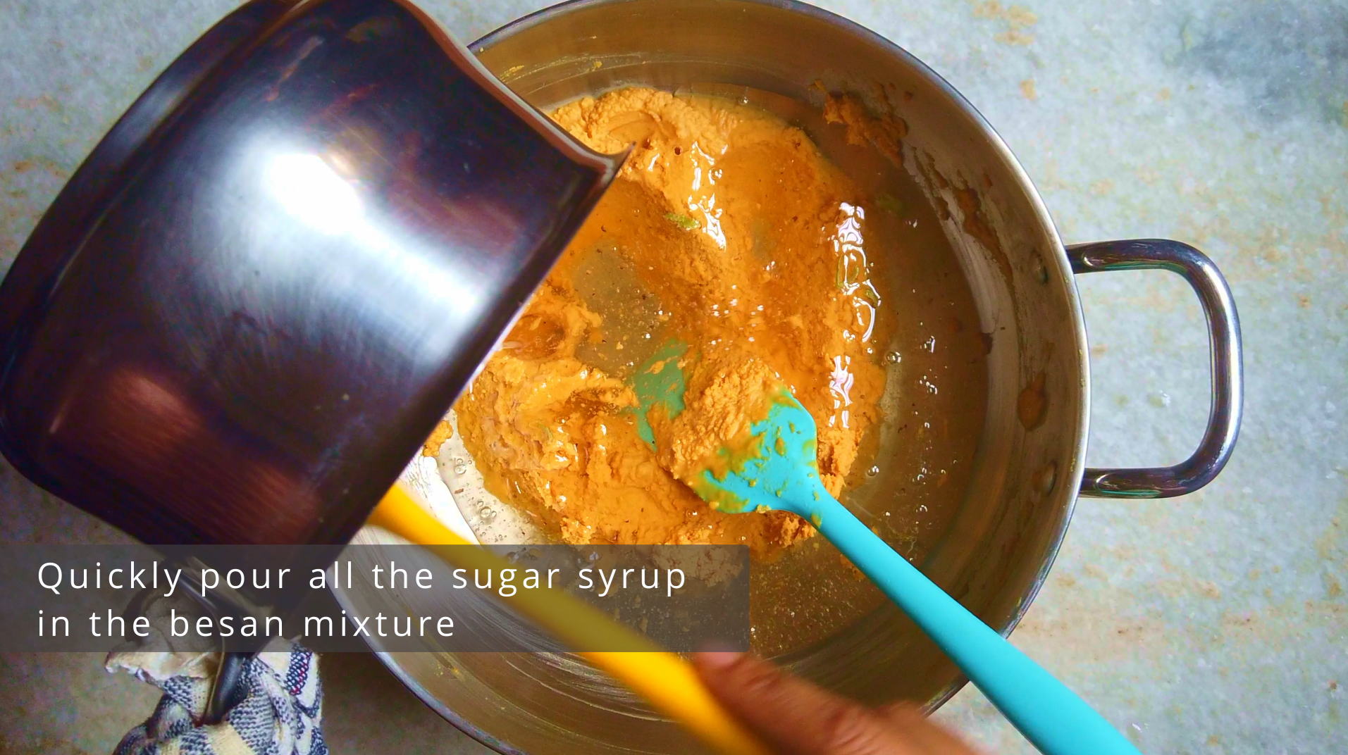 • Step 5: Once the sugar syrup reaches 1 1/2 string consistency, then quickly pour all the sugar syrup in the besan mixture.