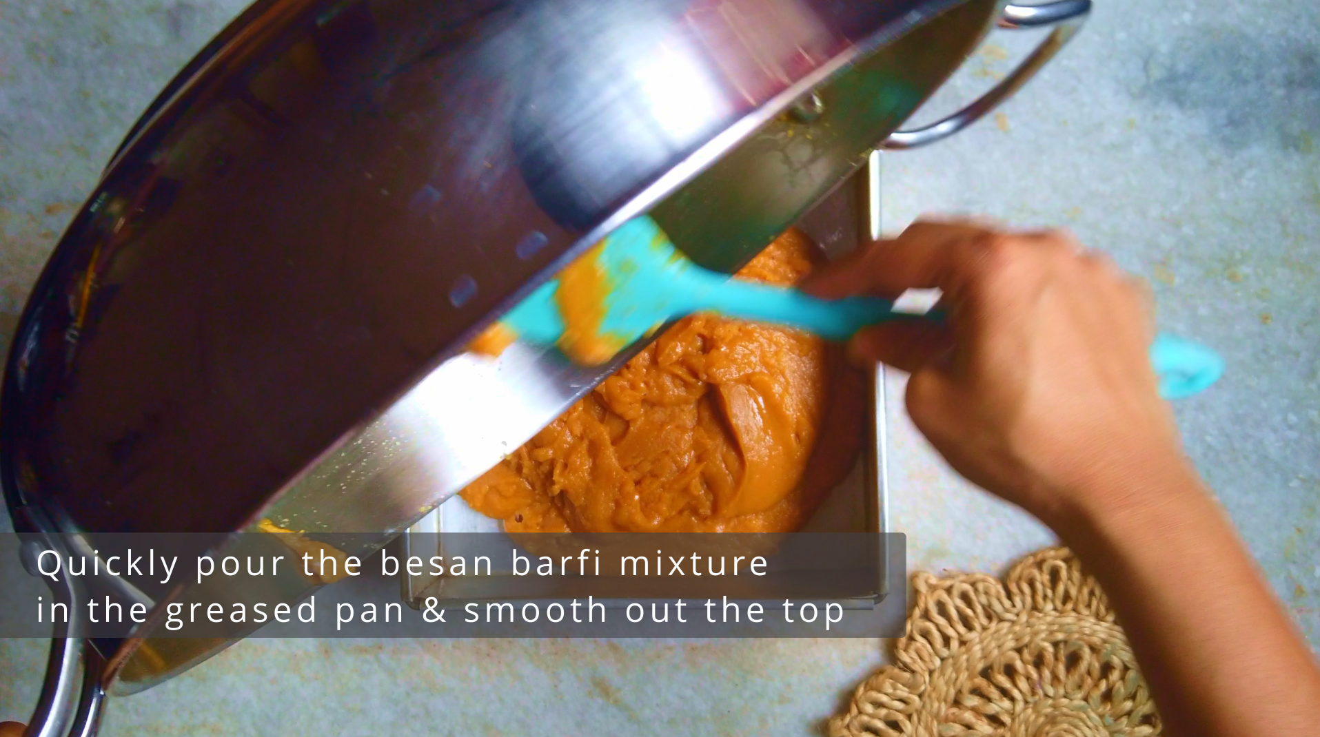 • Step 7: When mixed well, quickly pour the besan barfi mixture in the greased pan or tray.