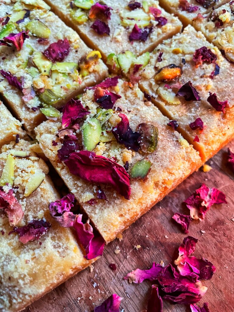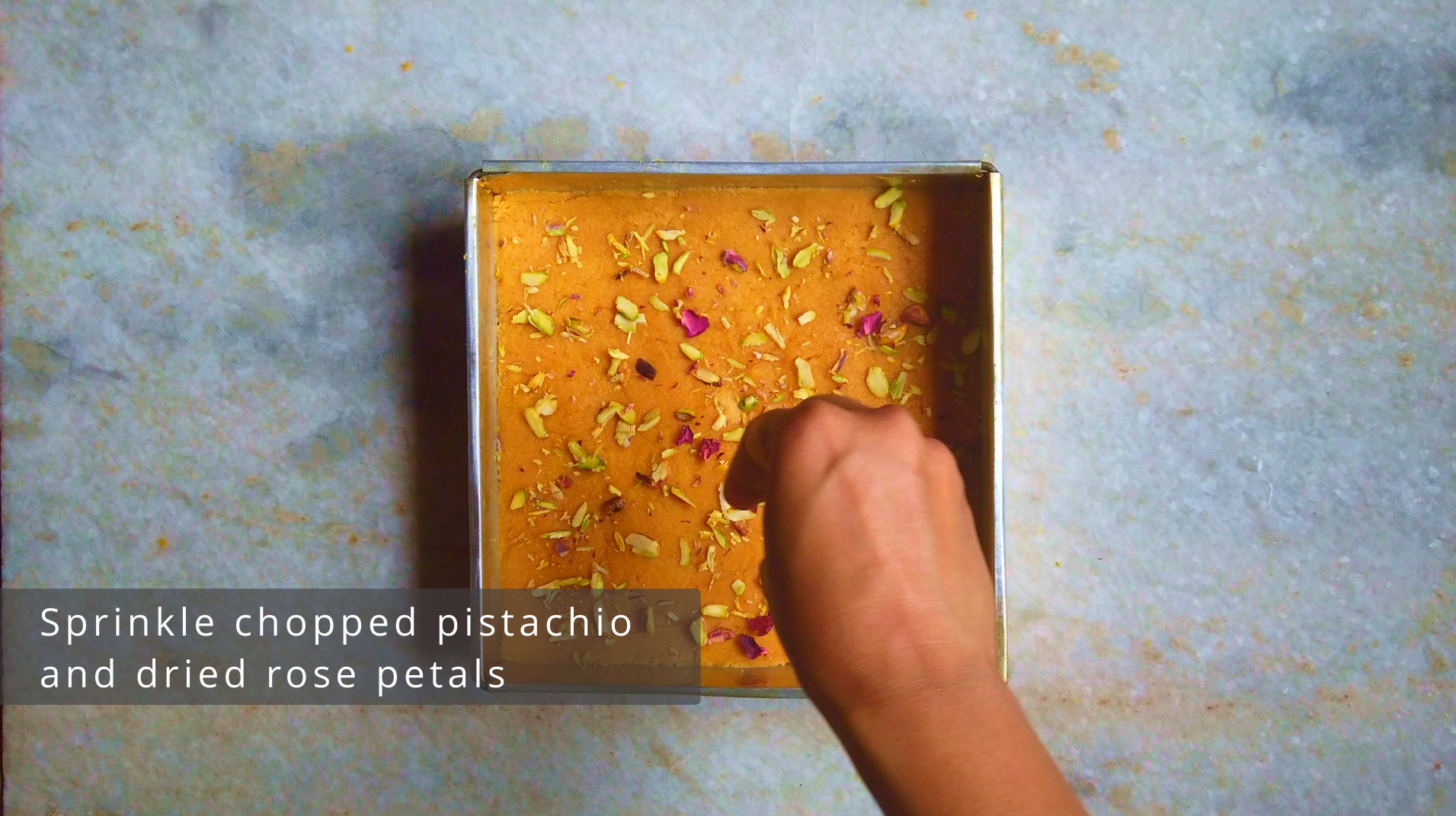 • Step 8: Shake the pan and then smooth out the top of the barfi. Sprinkle chopped pistachio and dried rose petals on top and press them, so they stick to the barfi.