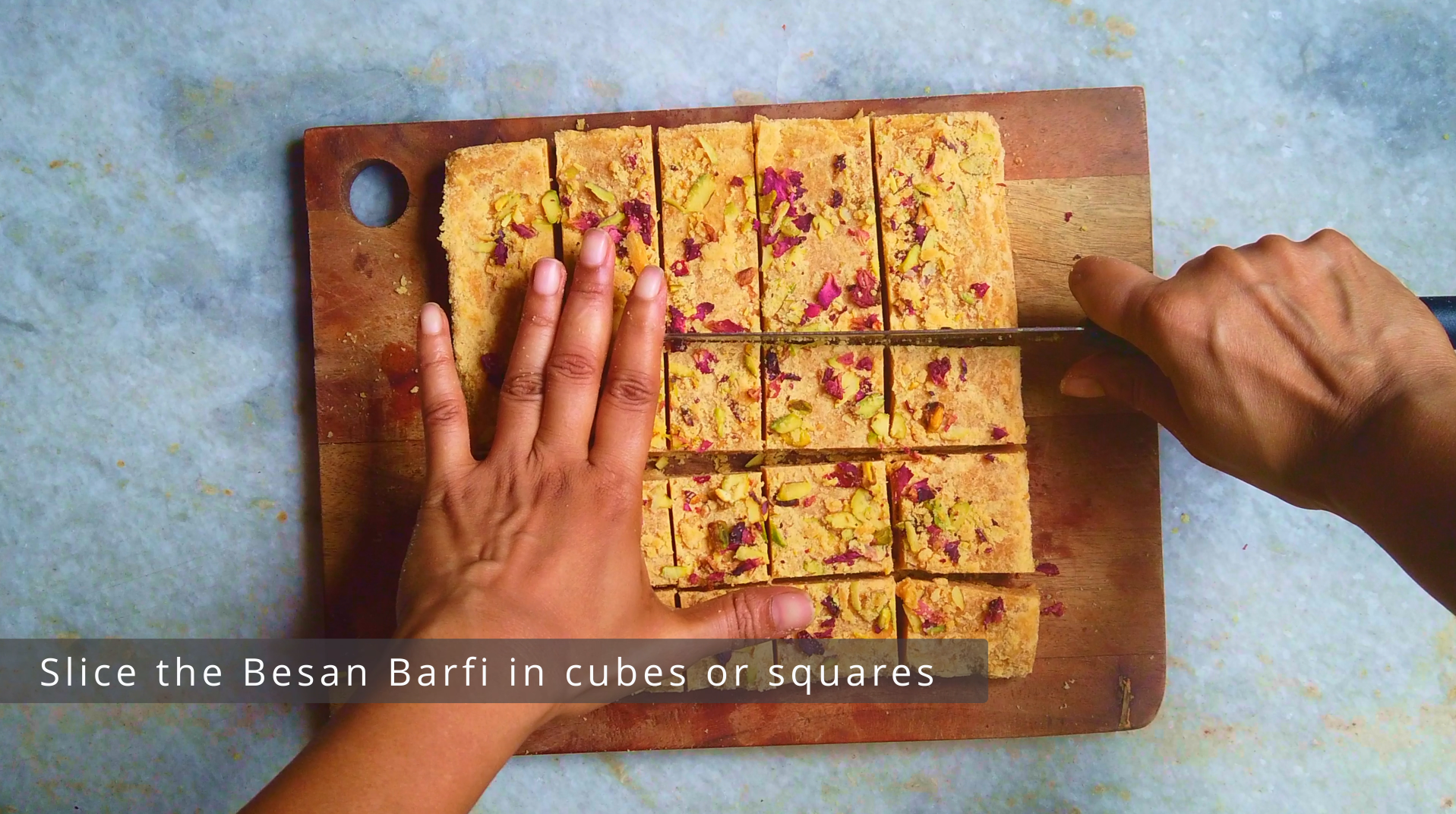 • While plain besan barfi tastes great on its own, you can add chopped nuts, raisins or even a sparkle of cardamom powder for extra flavour and a festive touch.