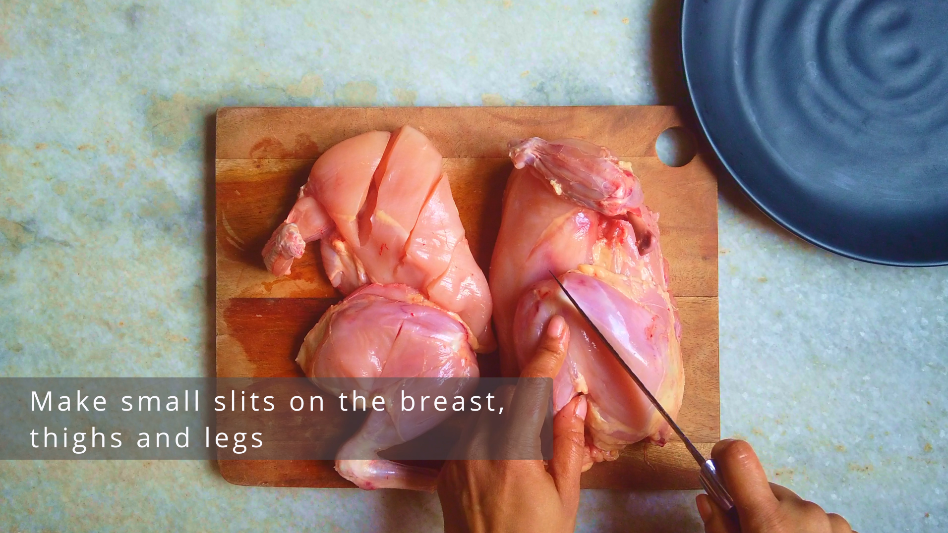 - Step 1: Cut the whole chicken into halves. Make small slits on the breast, thighs and legs. Set aside.