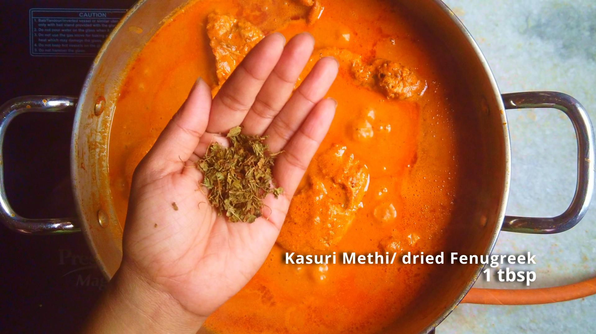 - Step 15: To crush the dried fenugreek leaves, rum them between the palms of your hands to release their flavour and create a coarse powder. Finish the gravy with crushed fenugreek, stir to combine. Turn off the heat.