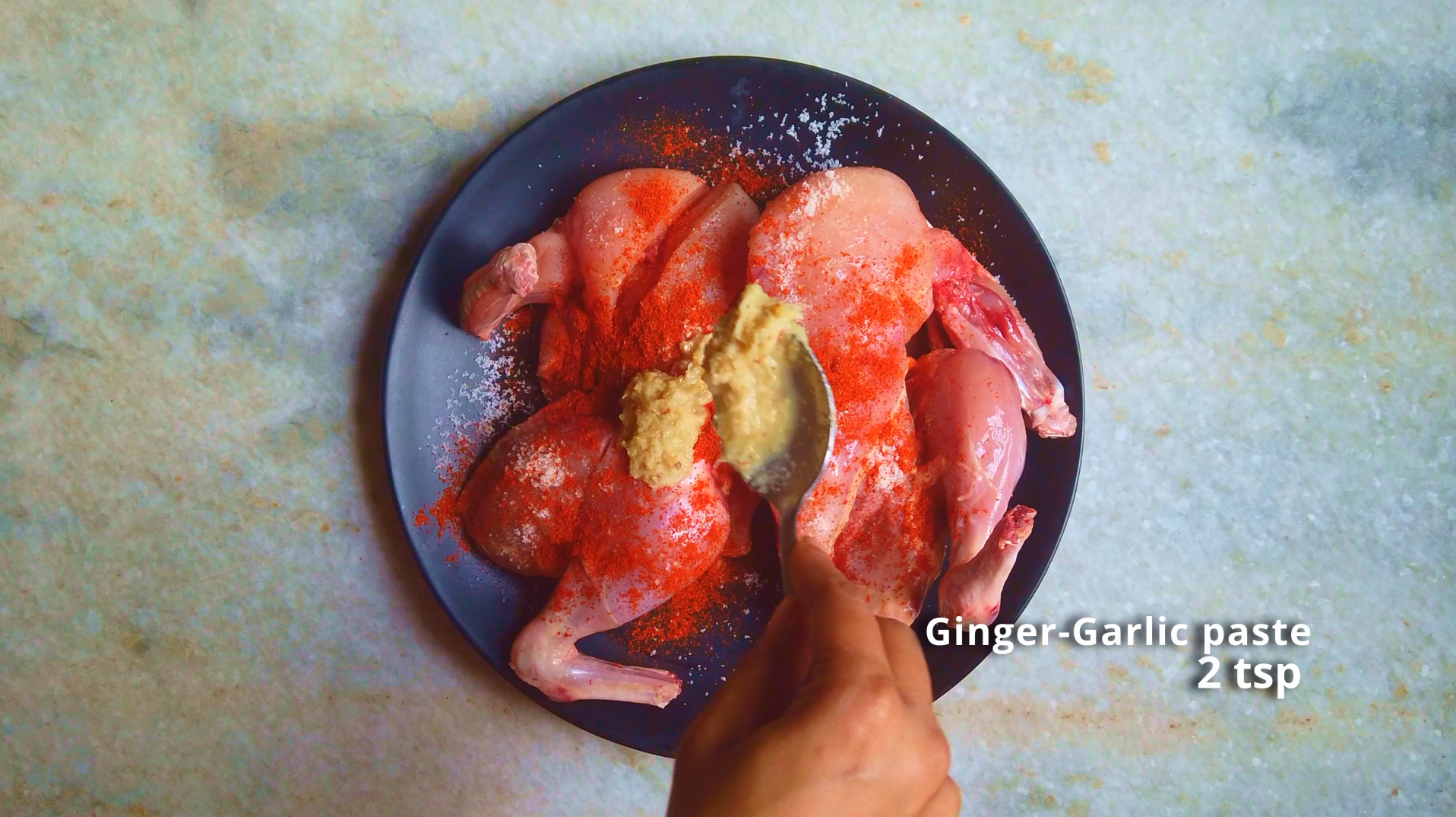 - Step 2: Place the chicken in a plate, add salt, red chili powder, ginger-garlic paste and lemon juice and apply generously all over the chicken. Keep it aside to marinate for 15-20 minutes.