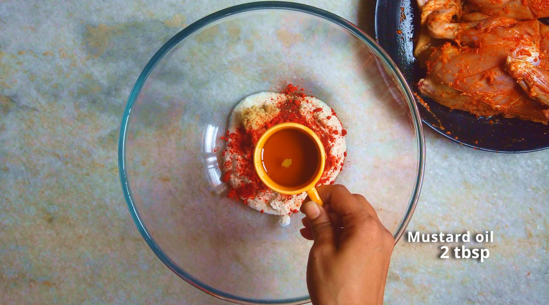 - Step 3: In a large mixing bowl, whisk together curd, black pepper powder, salt, ginger-garlic paste, Kashmiri Chili Powder, mustard oil and crushed kasuri methi.