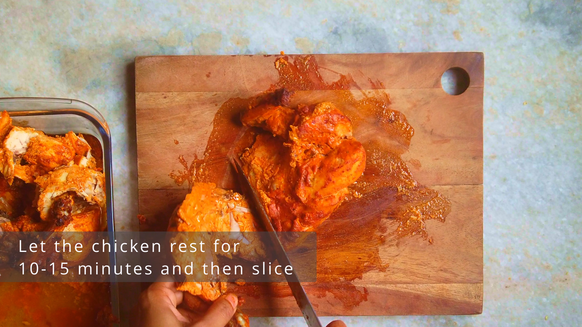 - Step 6: Remove the baked chicken from oven and let it rest for 10-15 minutes. Then slice the chicken as per your choice.
