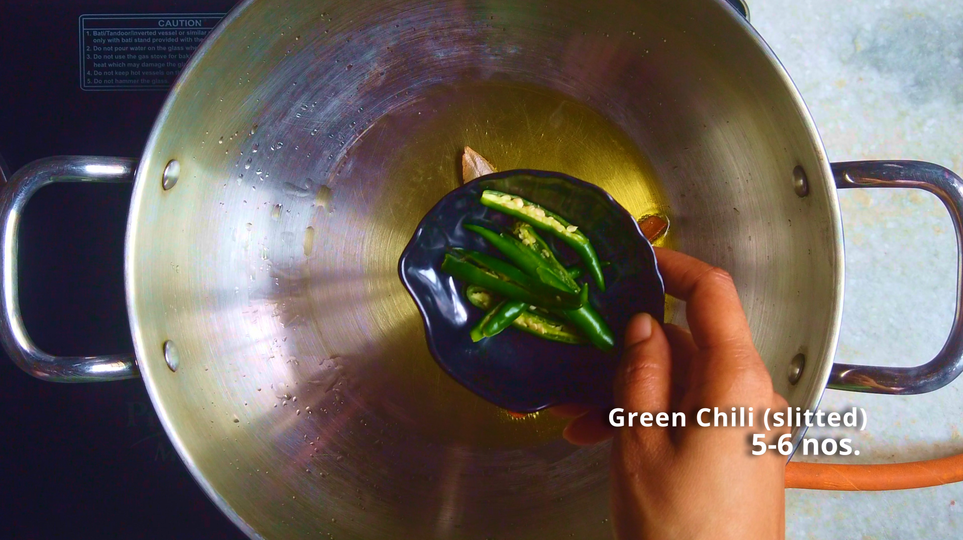 - Step 7: Heat ghee in a wok, then add bay leaf, green cardamom and cinnamon stick, saute them until they are fragrant. Add slitted green chili and saute for few minutes.