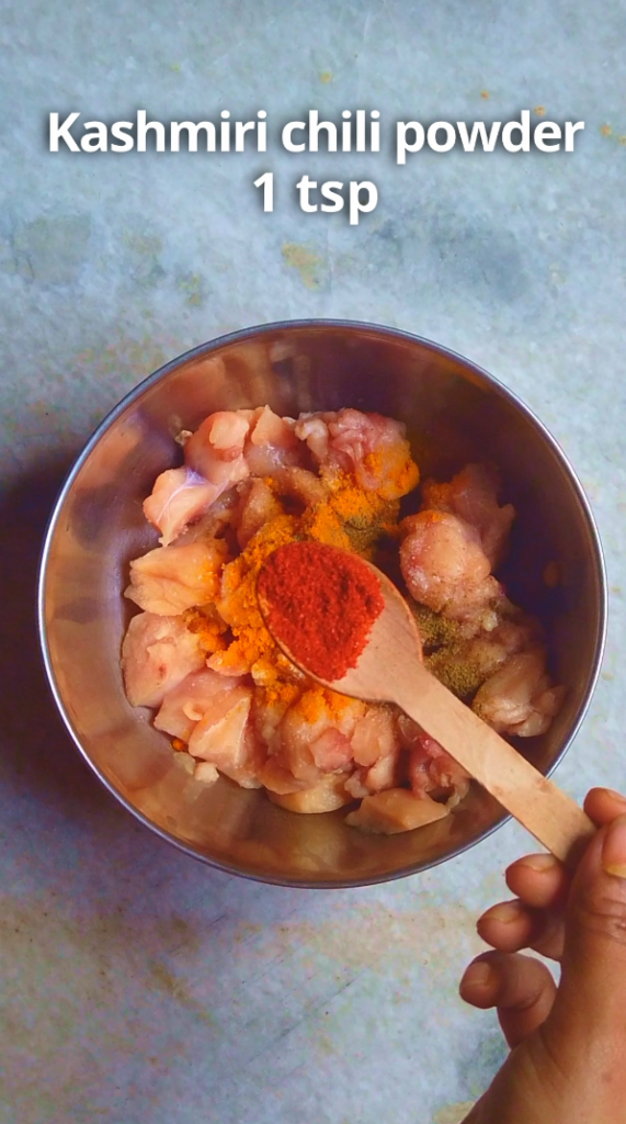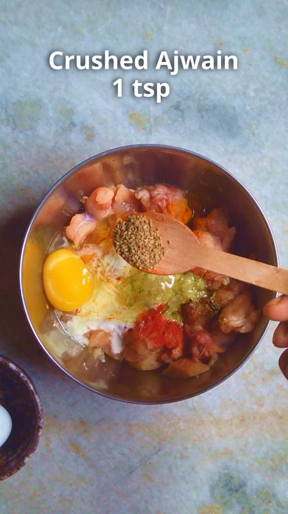- Step 1: In a mixing bowl, combine chicken pieces, salt to taste, turmeric powder, garam masala, kashmiri chili powder, yogurt, ginger-garlic-green chili paste, lime juice, egg, oil, crushed ajwain and crushed kasuri methi, mix everything properly. Marinate the chicken for 20-30 minutes.