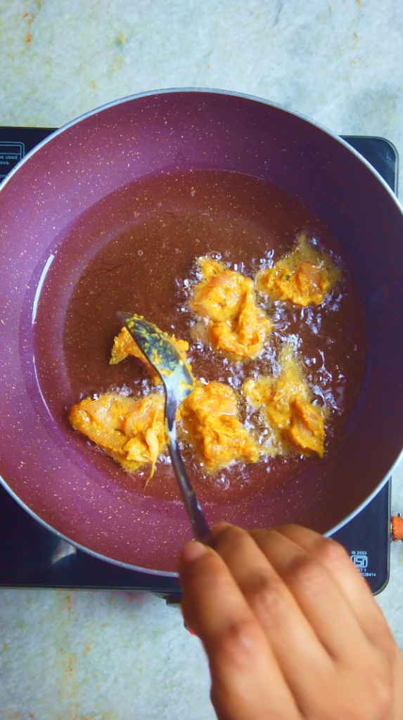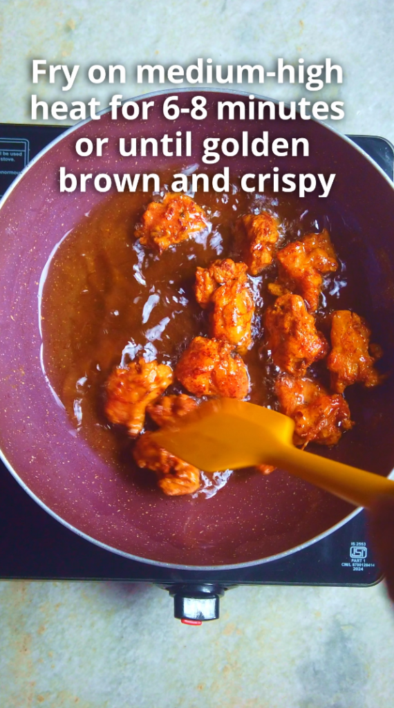 - Step 3: Heat oil for frying in a wok over medium-high heat. Once the oil is hot, drop each piece of chicken with a little mixture attached. Fry on medium-high heat for 6-8 minutes or until golden brown and crispy, stirring frequently so they fry evenly from all sides and the chicken properly cooks through. Drain over paper towels.