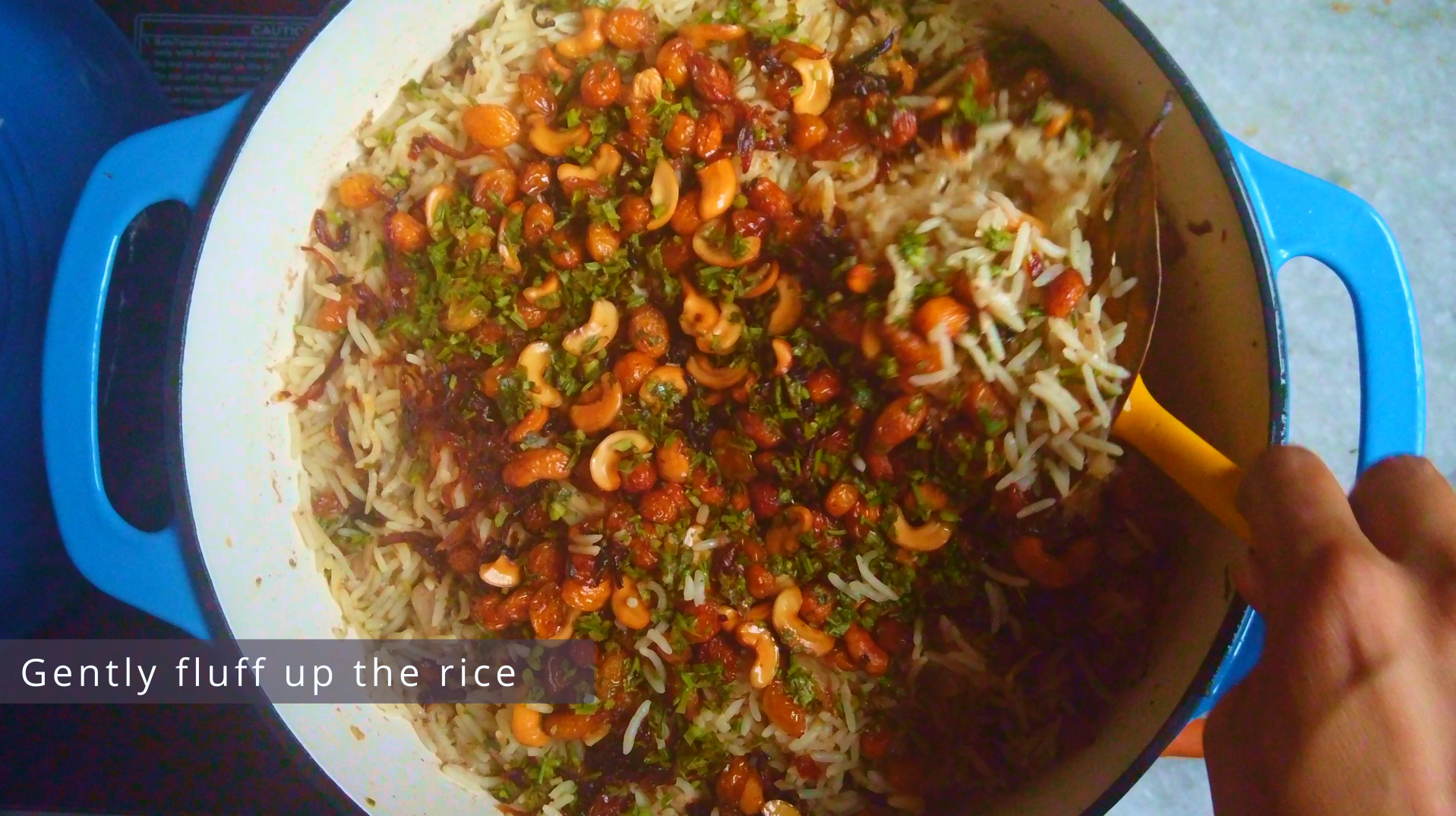 - Step 14: Cover the pot and keep it on low flame to dum for 10 minutes. Gently fluff up the rice and rest for another 15 minutes. If you see moisture at the bottom, then cook for longer.