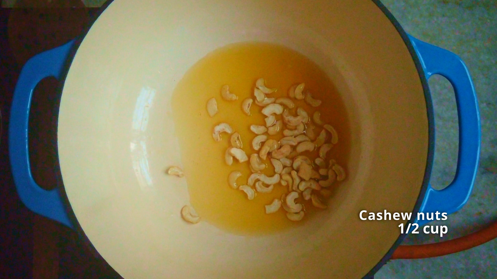 - Step 3: In a pot or dutch oven, add 2 tbsp ghee and heat it. Add the cashew nuts and fry them till lightly golden and crispy, remove to a plate.