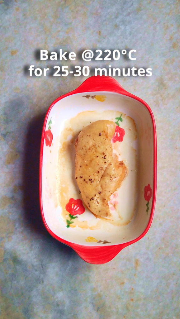 - Step 2: Preheat the oven @220°C. Rub the chicken with olive oil and sprinkle all over with 1 tsp salt and 1 tsp black pepper powder. Roast for 25-30 minutes or until a thermometer inserted into the thickest part of the breast reads between 160ºF and 165ºF. Set aside to cool.