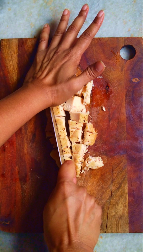- Step 3: When the chicken is cool dice the chicken into small pieces.