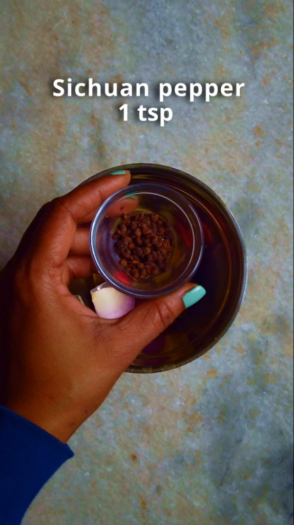 - Step 1: In a blender, combine chopped onion, chopped ginger, garlic, fresh red chili, Sichuan pepper, chopped tomatoes, coriander stems and sesame oil, blend until smooth.
