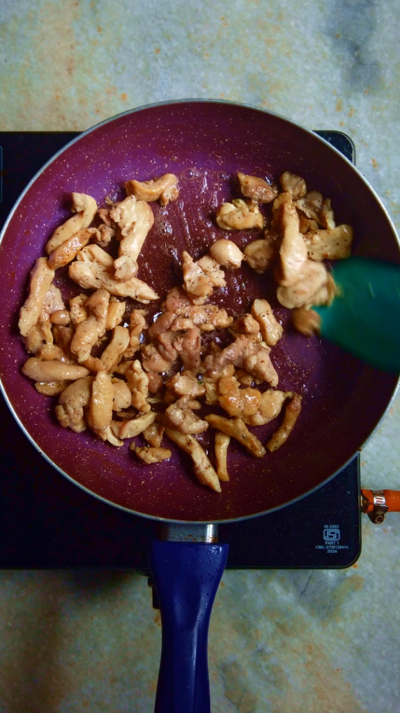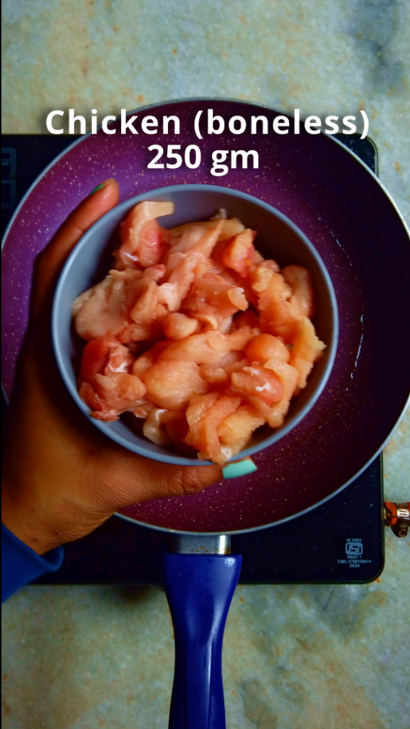 - Step 2: Heat oil in a Pan. Add chopped chicken, salt to taste and Black pepper powder, sear the chicken on high heat.