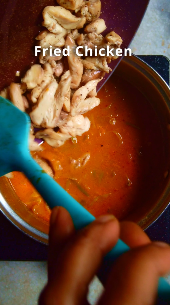 - Step 5: Add the fried chicken, cover and cook for 6-8 minutes on low heat. Once the chicken is cooked through, add chopped spring onion and lime juice, stir to combine.