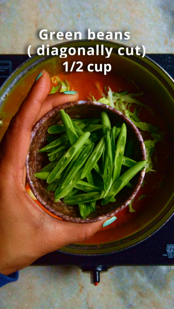 - Step 4: Add chicken broth, salt to taste, julienned carrots, shredded cabbage and beans, stir to combine. Cover & cook on low heat for 5-6 minutes until cooked well.