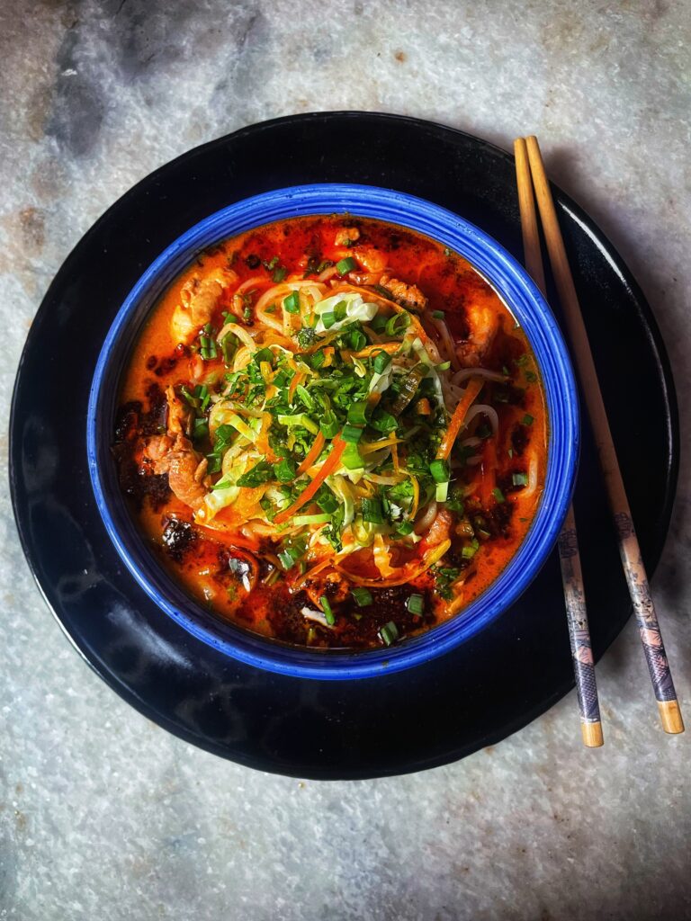 - Step 7: In a bowl add in your cooked noodles, pour chicken thukpa soup on top, top with shredded cabbage, chopped coriander, chili oil and chopped spring onion.
