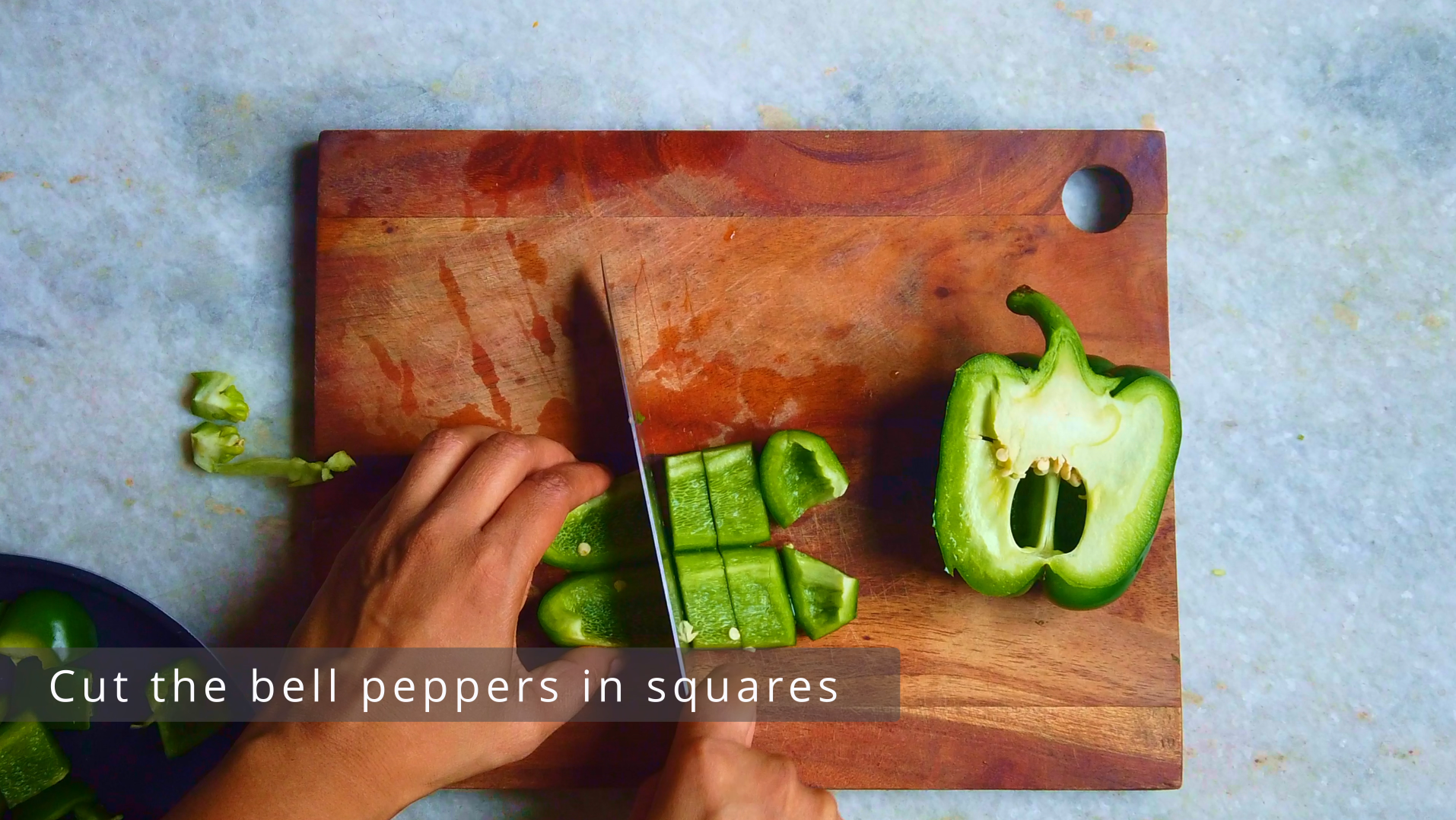 - Step 2: Cut onions and bell peppers in squares.