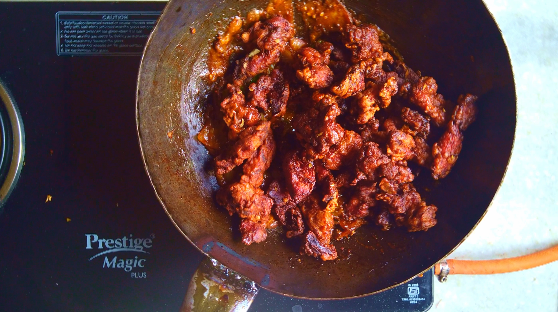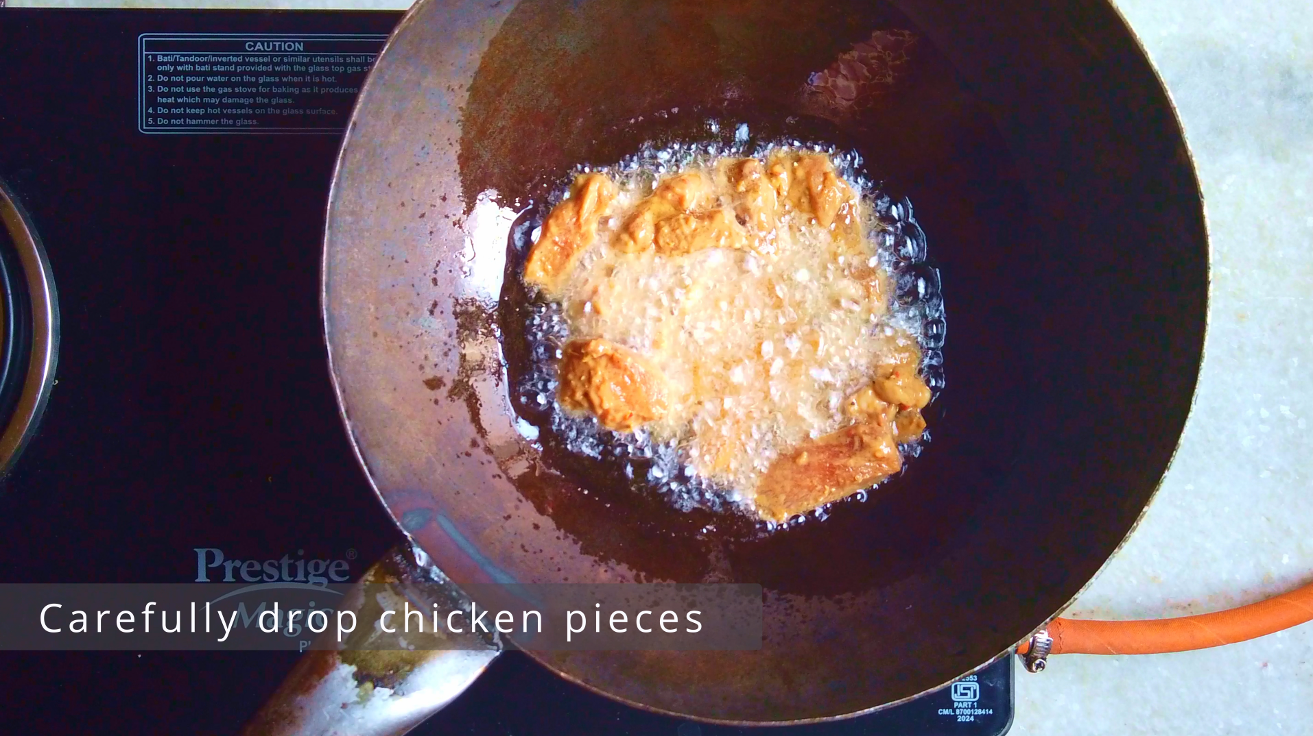- Step 4: Heat oil in a wok. Carefully drop chicken pieces in oil on medium heat and fry until golden brown and crisp. Double fry the chicken for extra crunch. Keep aside.