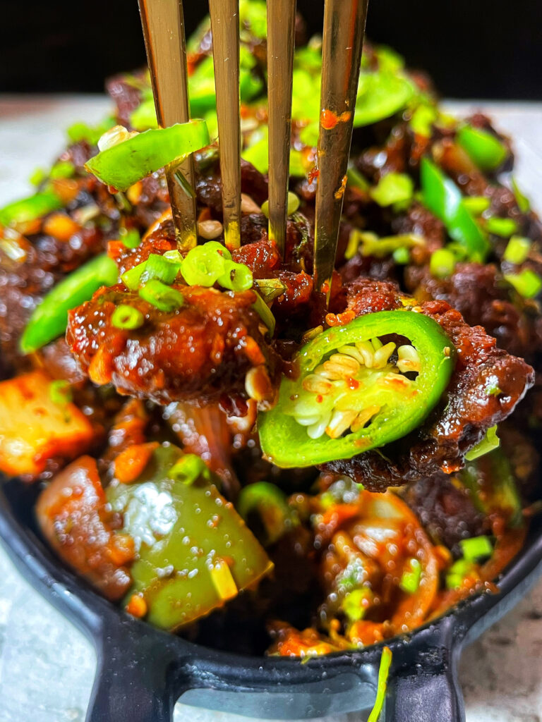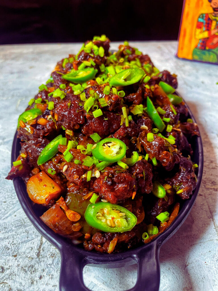 Unlike its sweeter cousin, Chicken Manchurian, Chili Chicken is all about heat and depth- thanks to a fusion of Indian spice blends and Chinese wok techniques. You’ll find both boneless and bone-in versions, depending on regional preference. The combination of sautéed onions, green bell peppers and fiery sauce gives the dish its signature kick and texture.