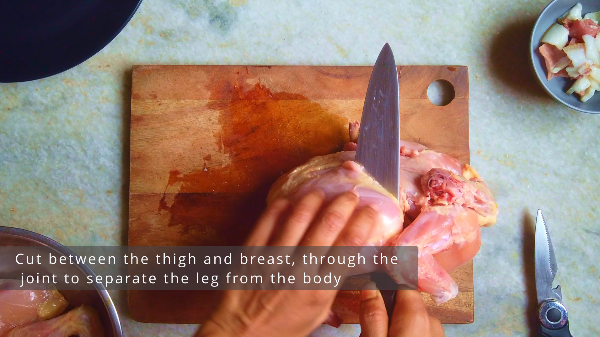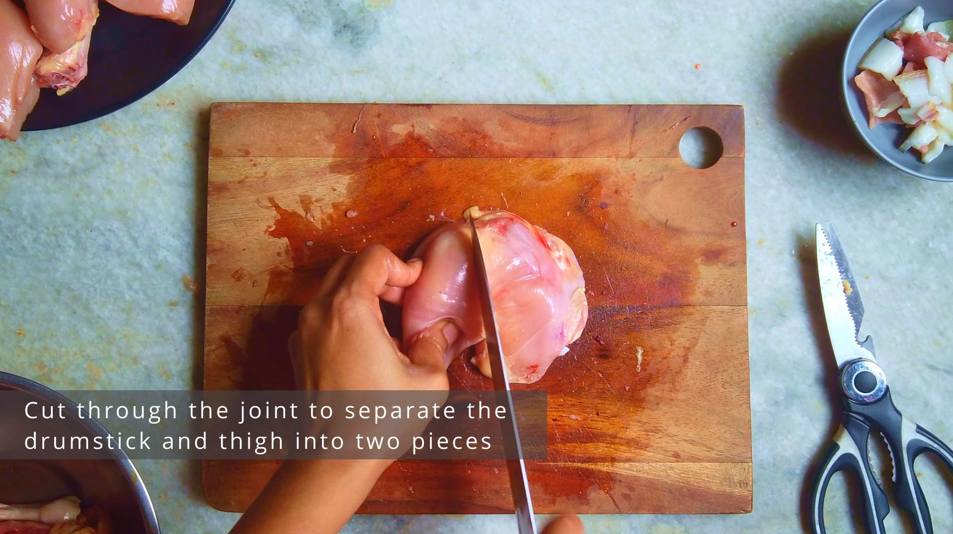 - Step 2: Place a leg on the cutting board, look for the line of fat that makes the joint between the drumstick and the thigh. Cut through the joint to separate the drumstick and thigh into two pieces. Repeat for the other leg.