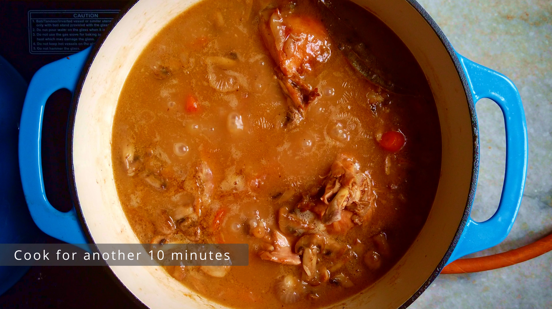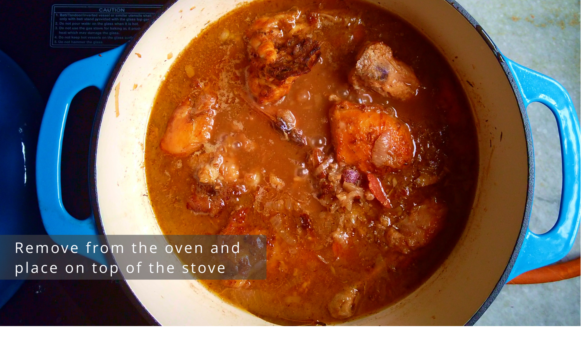 - Step 12: Preheat the oven @120ºC. Cover the pot and place in the oven for 30-40 minutes, until the chicken is just not pink. Remove from the oven and place on top of the stove.