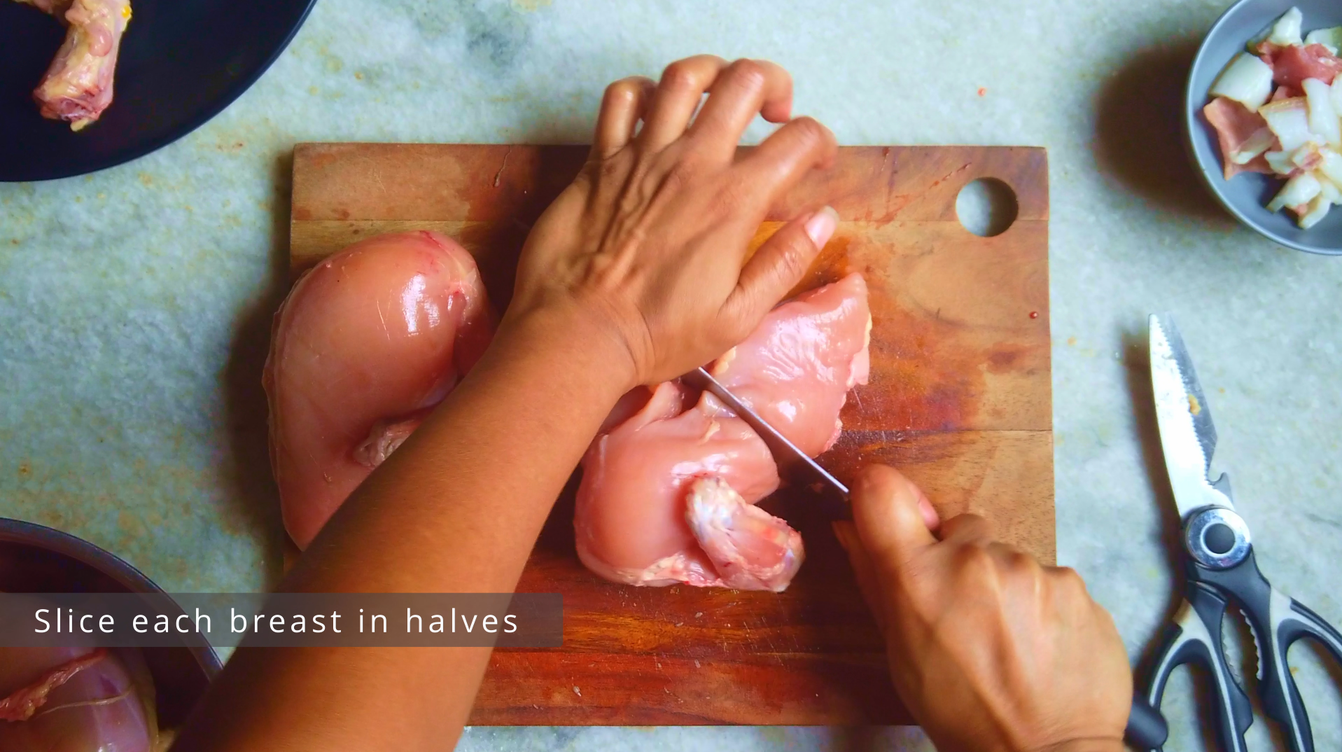 - Step 3: Cut through the center of the breastbone. Press down firmly to break the bone and slice all the way through without removing the wings. This will result in two breast halves. Reserve the back portion of the chicken for Chicken stock. Now slice each breast in halves.