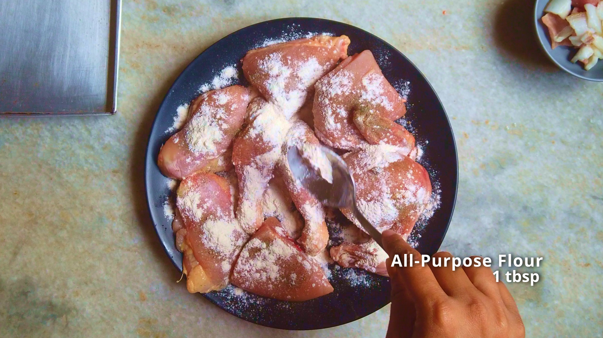 - Step 4: Season the chicken with salt and pepper. Sprinkle the chicken with flour and coat them lightly. Set aside.
