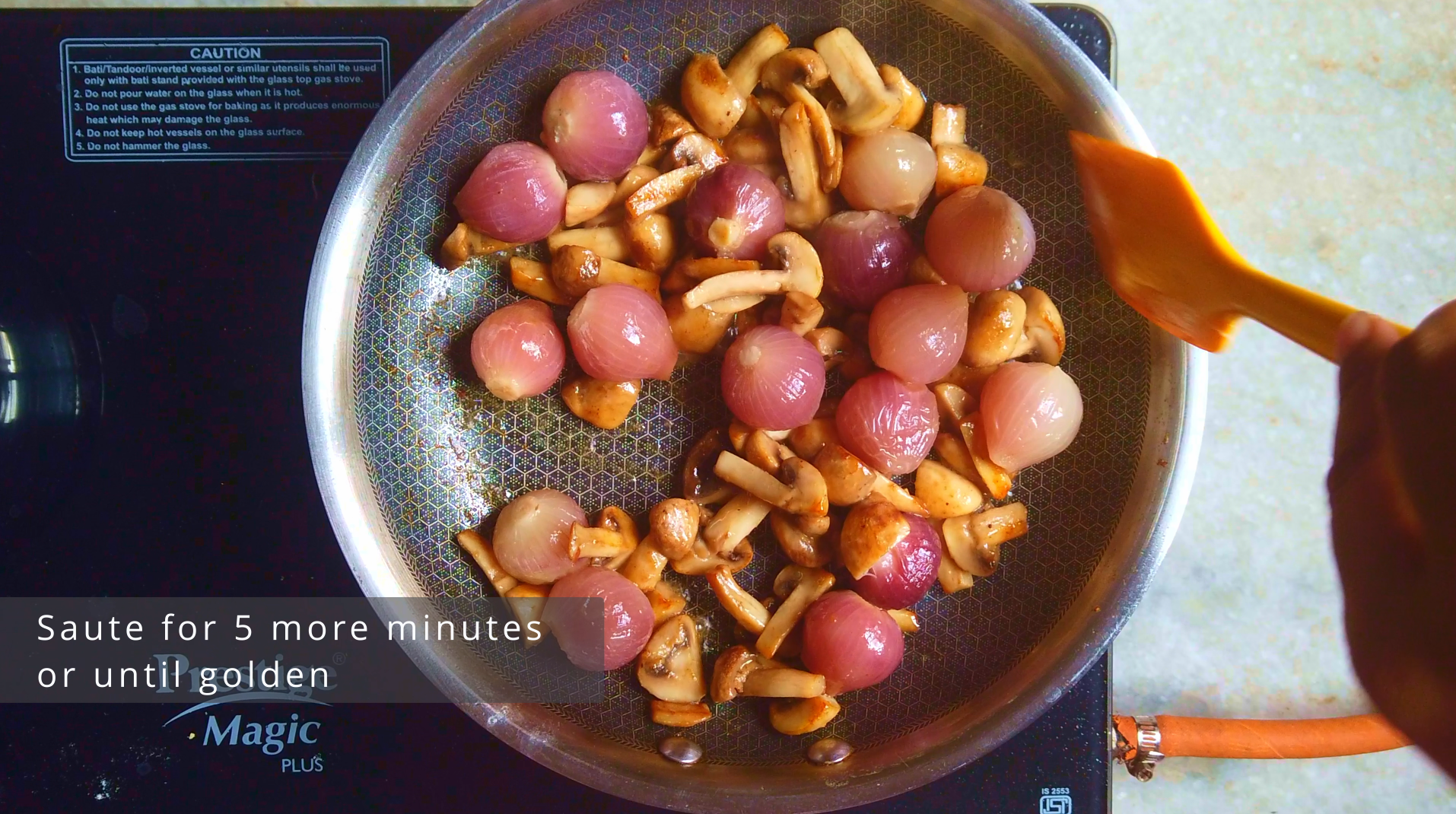 - Step 6: Heat butter in a pan and add the quartered mushrooms, saute for 5 minutes on until golden. Then add the cooked onions and saute for 5 minutes or until there are golden patches.