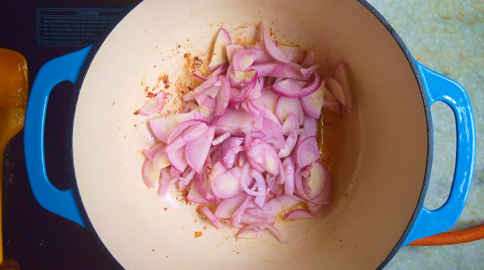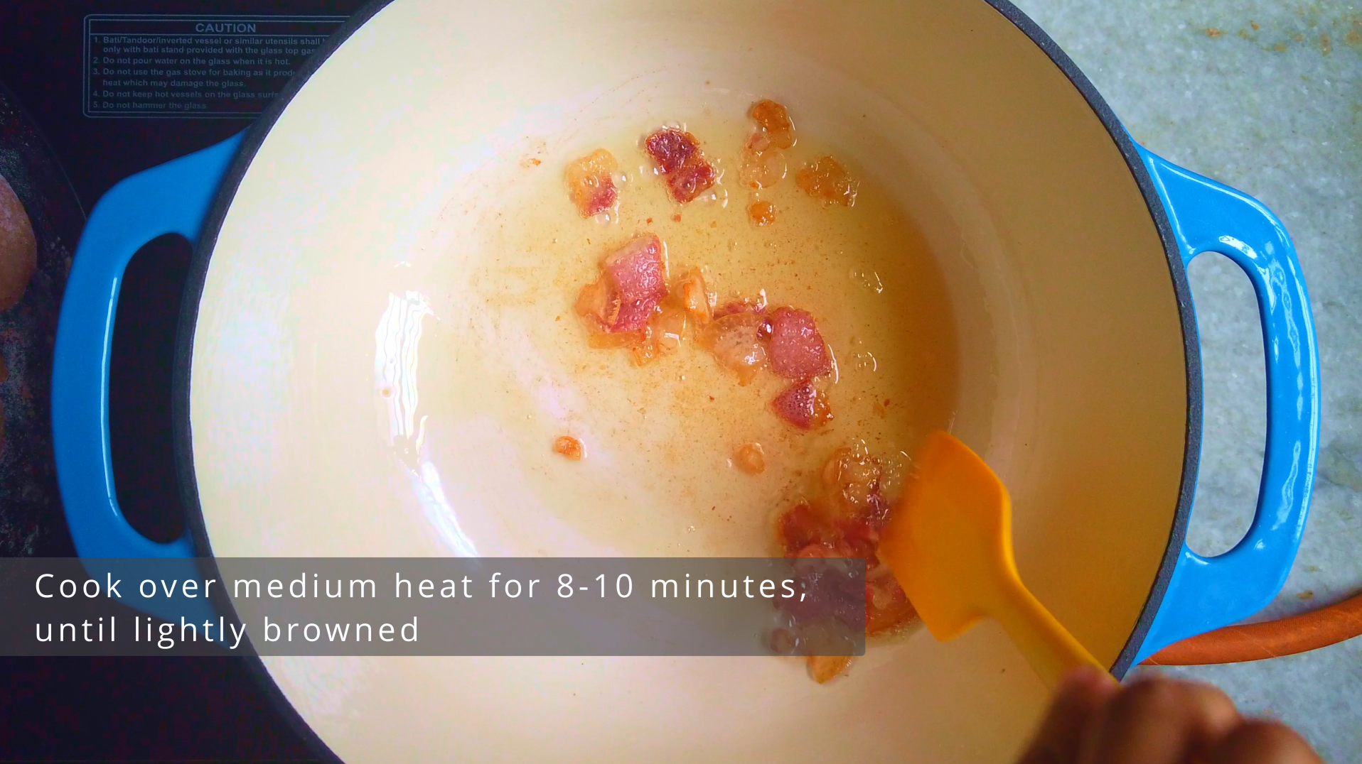 - Step 9: Add bay leaf and sliced onions and cook over medium heat for 6-8 minutes, stirring occasionally, until the onions are lightly browned.