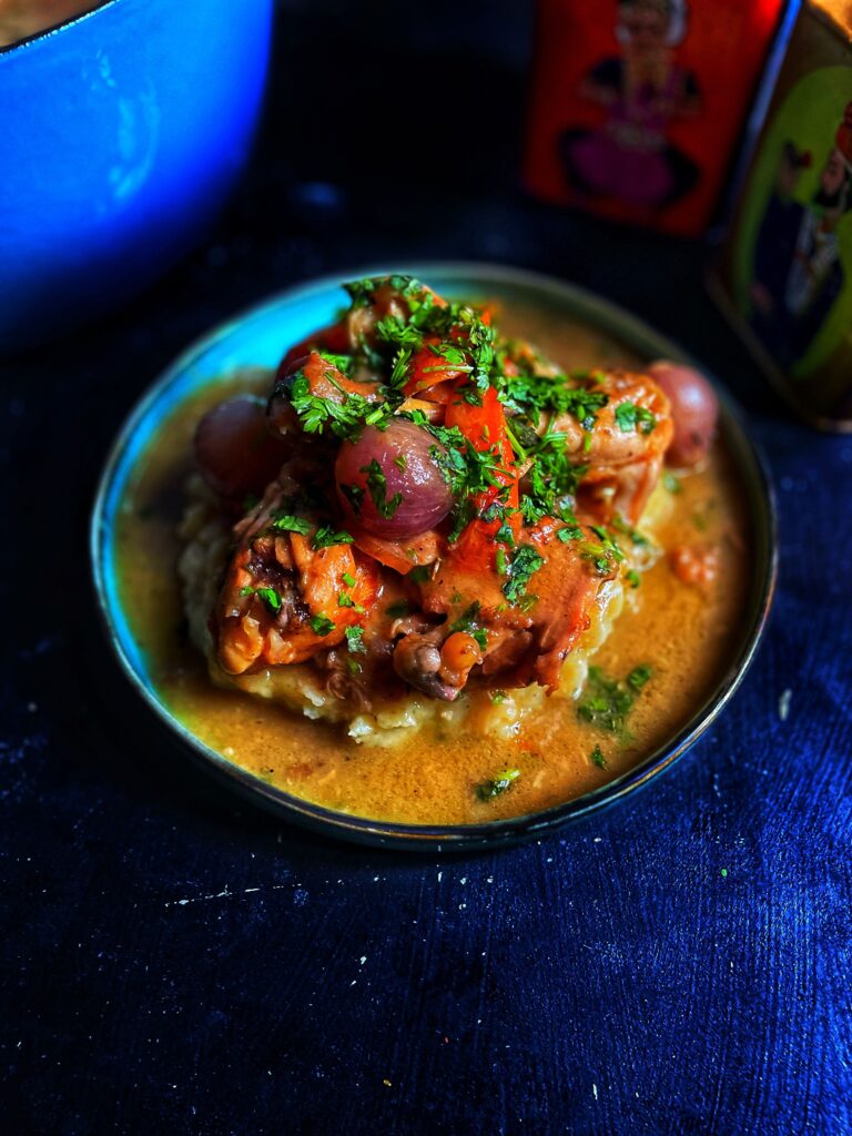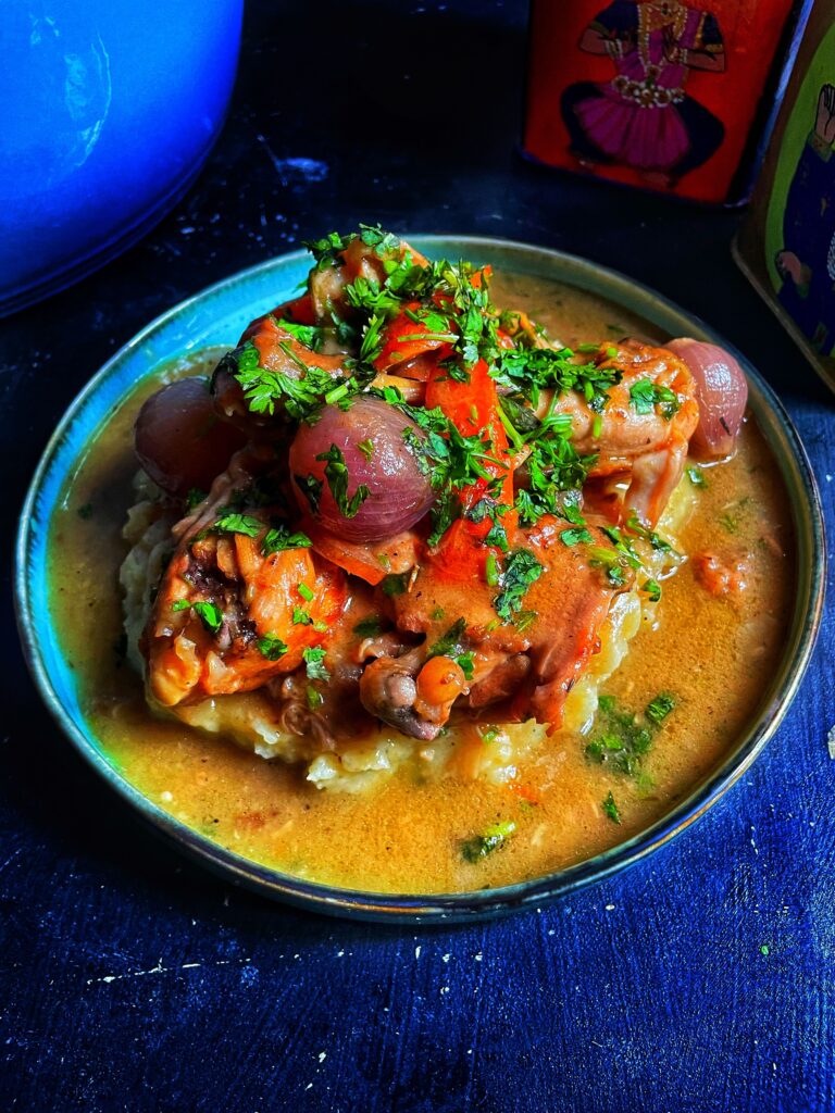 This classic relies on the robust character of red wine, which forms the backbone of the sauce. As the chicken cooks, the wine reduces and melds with the sautéed vegetables and meat juices, creating a glossy, full-bodied gravy. Mushrooms bring an earthy note, small onions add sweetness as they soften and caramelized and the salty richness of bacon ties everything together. Each element plays an essential role, making the stew feel balanced and complete. It requires time more than complexity, browning the chicken well at the start builds essential flavour and letting it simmer gently ensures the meat stays succulent. The dish rewards patience, the longer the ingredients share the pot, the deeper and harmonious the flavour become.