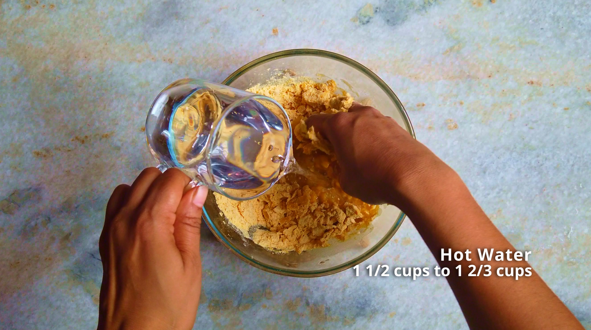 - Step 2: Gradually add 1 1/2 cups hot water and stir with your fingers until dough starts to pull together.