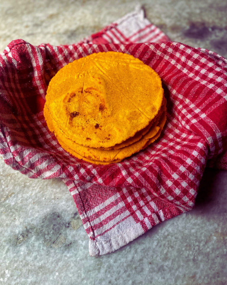To keep corn tortillas fresh, it’s important to prevent them from drying out. Once cooled, wrap any leftover tortillas snugly in plastic wrap, beeswax wrap or seal them in zip-top bag with as much air removed as possible. Store them in the refrigerator and try to use them within 2-3 days for the best texture and flavour.