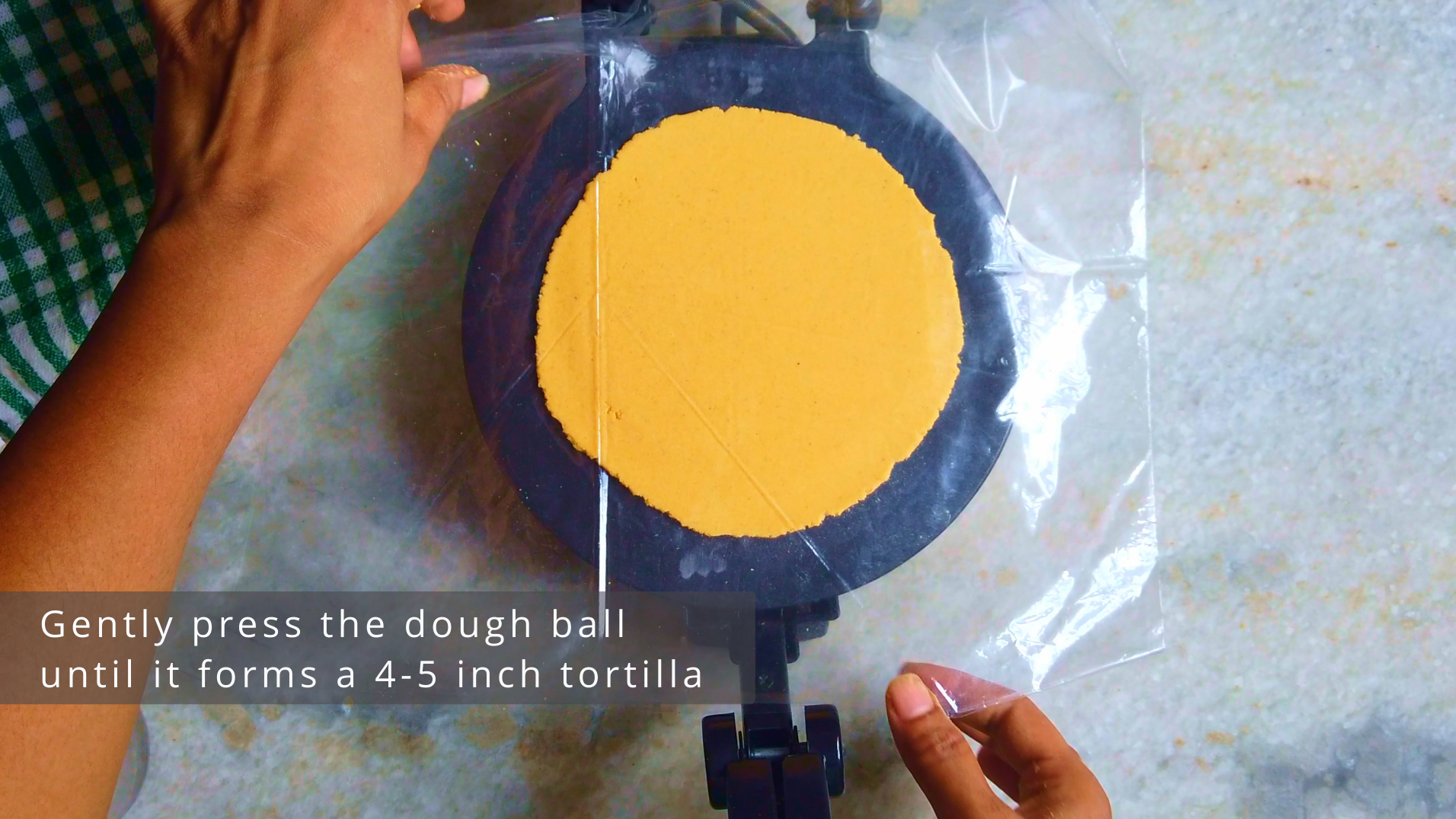 - Step 6: Place the dough ball between two pieces of plastic and use a flat-bottom pan/ tray or a tortilla press or I have used a cold roti maker (just don’t plug it in) to press the dough. Gently press the dough ball until it forms a 4-5 inch tortilla. Place a clean kitchen towel over a hotpot for cooked tortillas, set aside.