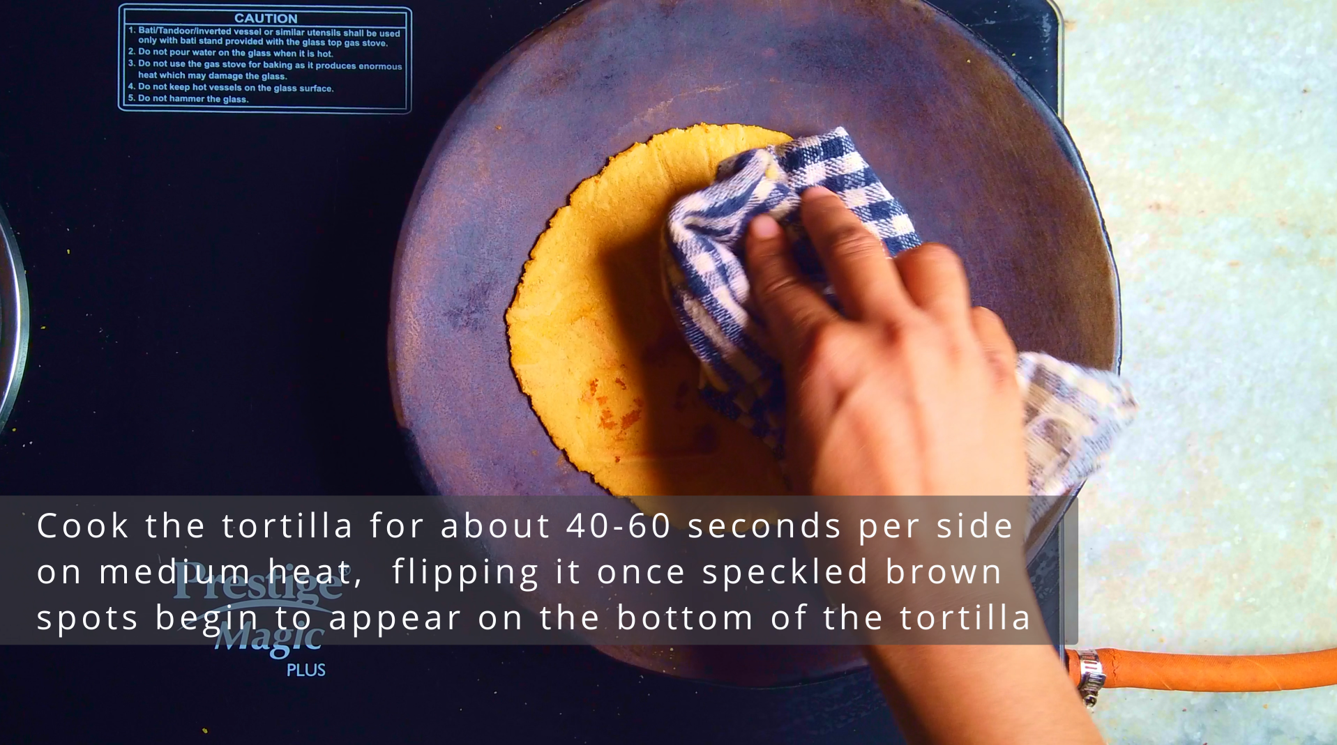 - Step 7: Heat a cast-iron skillet/tawa over medium-high heat. Once the pan is nice and hot, gently peel the tortilla away from the plastic wrap and lay the tortilla flat in a skillet/tawa. Cook the tortilla for about 40-60 seconds per side, flipping it once speckled brown spots begin to appear on the bottom of the tortilla. The tortillas will likely bubble up while cooking, especially on the second side, which is a good sign. Once its cooked, transfer the tortilla to the prepared hotpot, fold the towel over to keep warm, so the tortillas do not dry out. Repeat pressing and cooking with the remaining dough, stacking and wrapping tortillas.