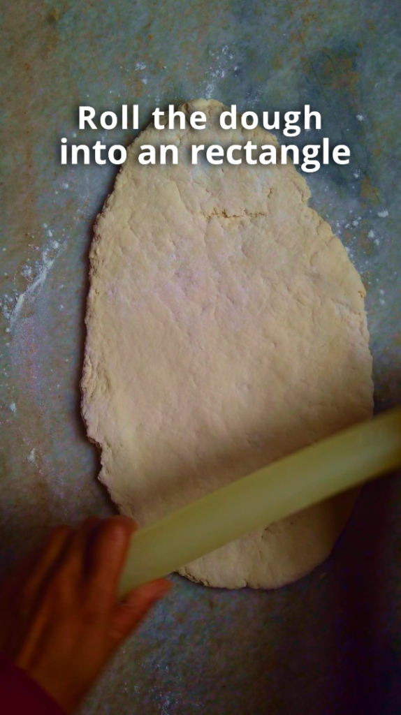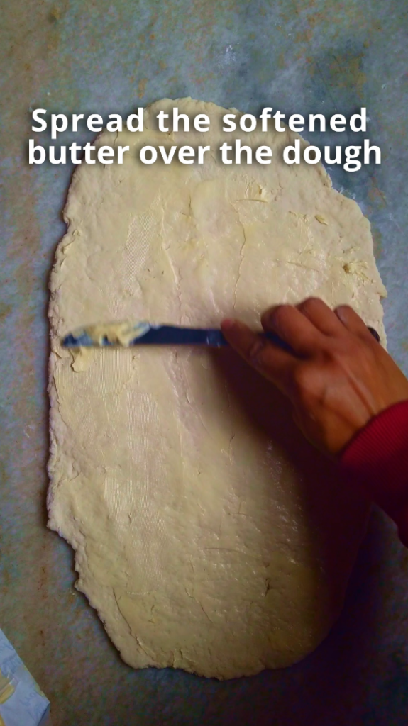 - Step 3: On a floured surface, roll the dough into an rectangle. Spread the softened butter over the dough. Fold the dough in thirds, like a letter, so that the dough is in 3 layers. Cover and place in the fridge to chill for a minimum of 30 minutes.
