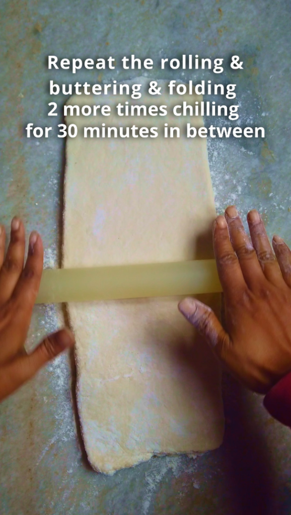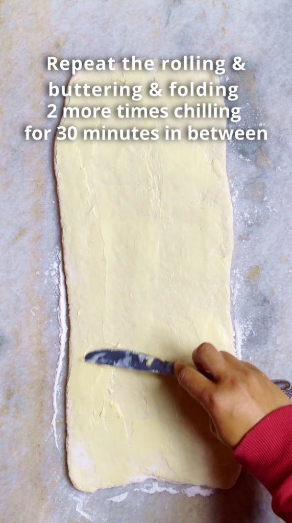 - Step 4: Repeat the rolling and buttering, and folding 2 more times chilling for 30 minutes in between. Then wrap the dough in plastic wrap and refrigerate for storing or freeze for long-term storage.