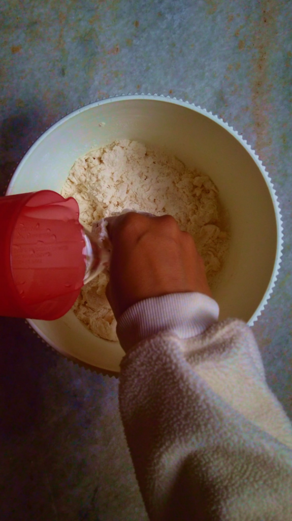 - Step 1: In a mixing bowl, combine flour, salt and oil. Pour in almost all of the water and stir until a shaggy dough forms.