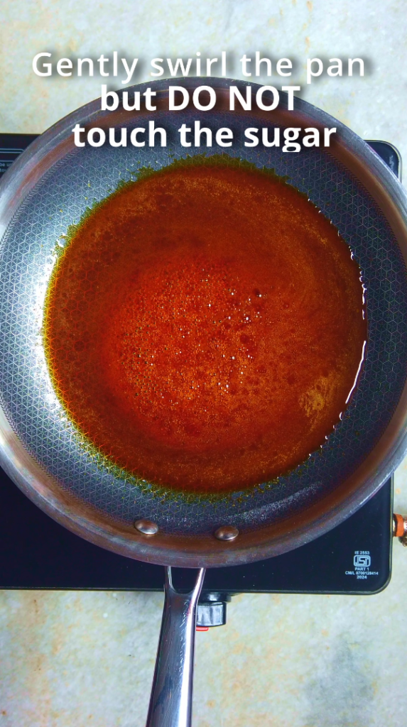 - Step 3: As you see the sugar crystals around the sides of the pan start melt, turn golden and liquefy, gently swirl the pan but DO NOT touch the sugar, while the caramel cooks to ensure the sugar solution caramelizes evenly.