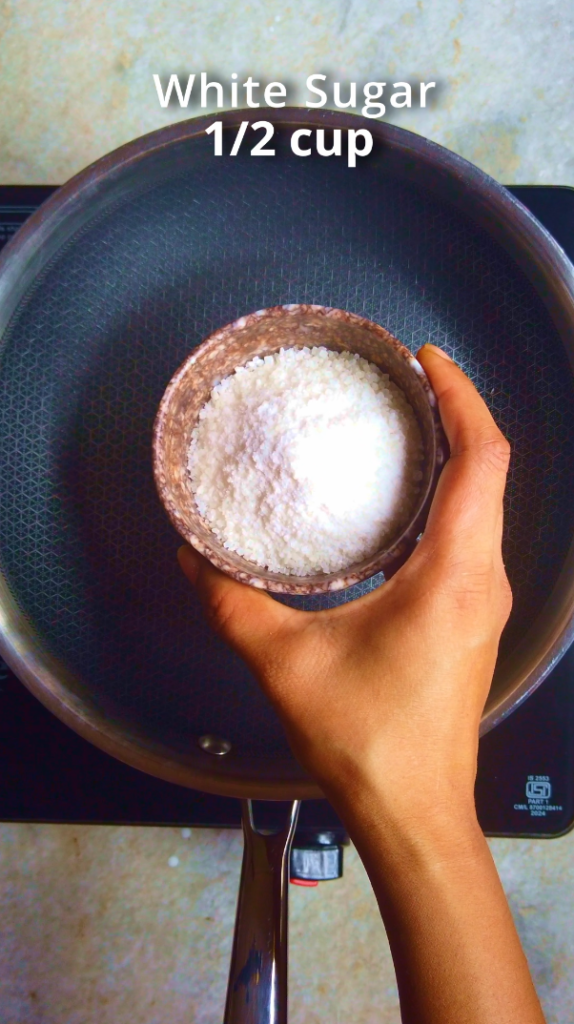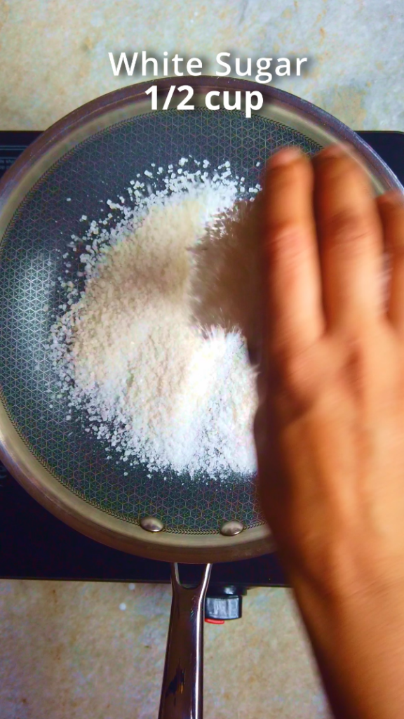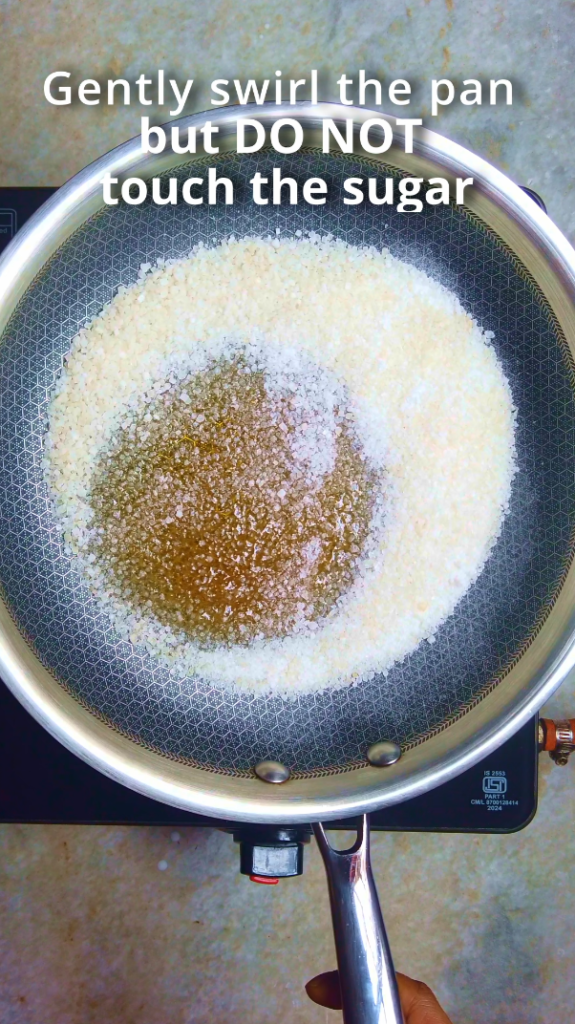 - Step 2: In a pan add sugar in an even layer. Place the pan over medium-high heat and let the sugar melt.