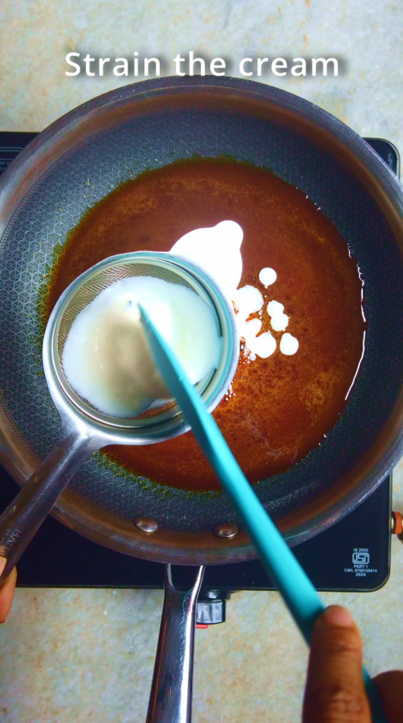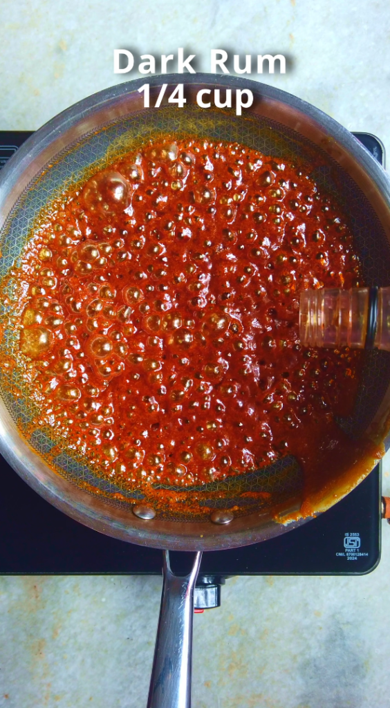 - Step 4: Strain the warm cream and add butter in the frying pan, stir to combine. Then add dark rum and stir to combine until there are absolutely no lumps of sugar or else the caramel will turn grainy once it cools. Keep aside.