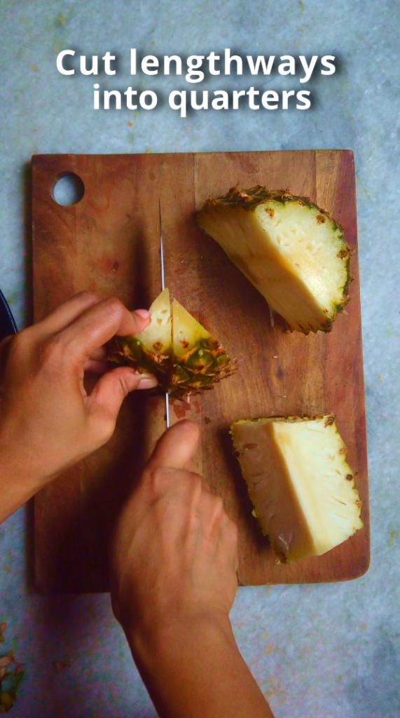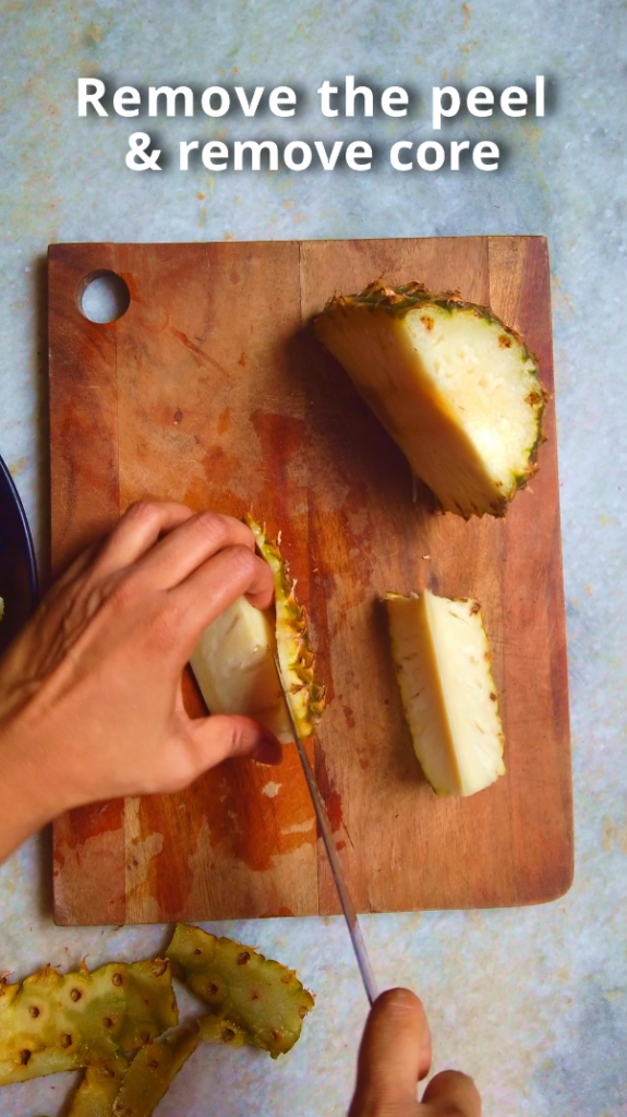 - Step 5: Trim & peel pineapple. Cut lengthways into quarters, remove core. Cut each quarter lengthways into thirds.