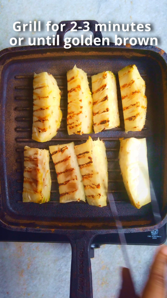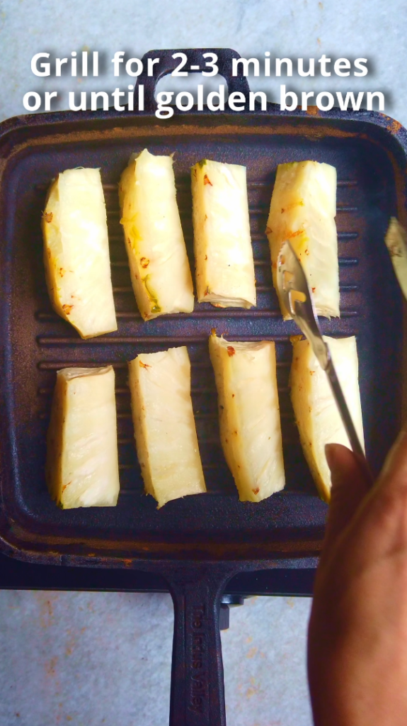 - Step 6: Heat a grill pan. Add the pineapple wedges to the pan. Grill for 2-3 minutes or until they’re golden brown and have grill marks. Then flip them over and grill another 2-3 minutes. Remove the pineapple from the pan.