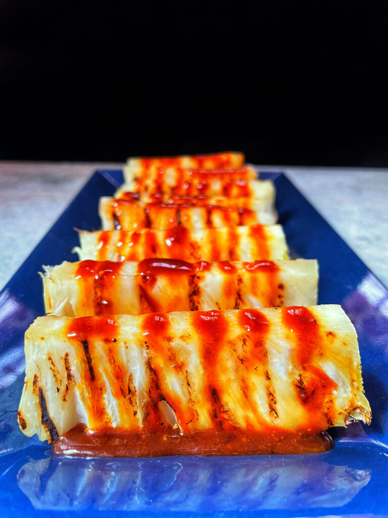 - Step 7: Arrange the grilled pineapple wedges on a serving platter. Drizzle the warm spiced rum caramel sauce over the top of pineapple. Serve immediately and Enjoy!!