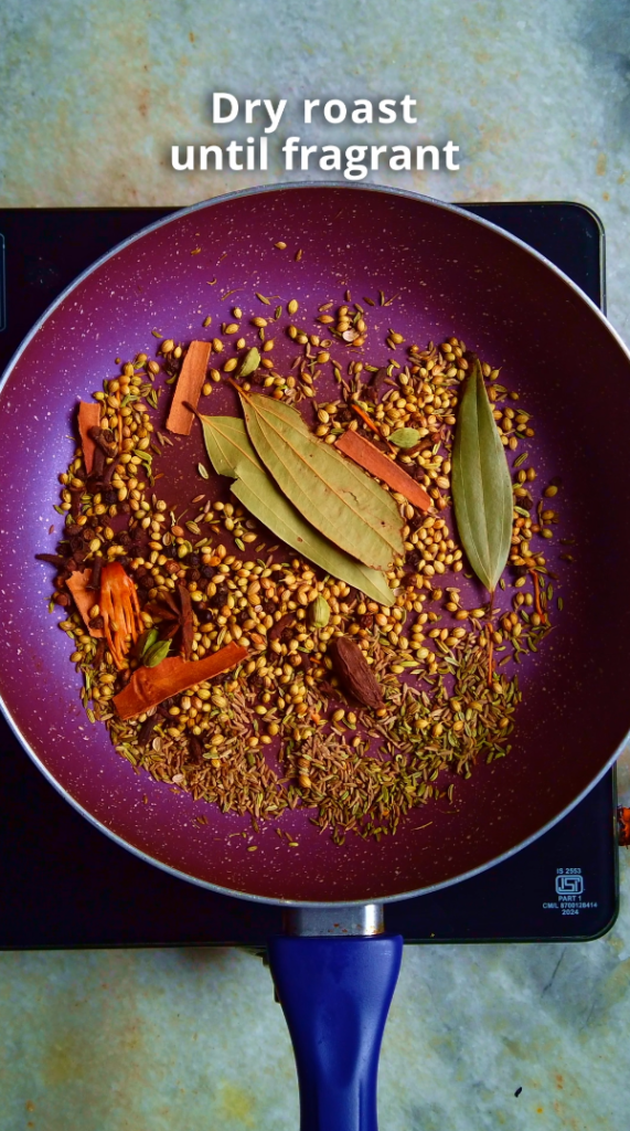 - Step 1: Heat a heavy bottom frying pan on medium low heat and add the spices to the pan. Dry roast the spices on low heat, stirring continuously, for about 5 minutes. At this point you should be able to smell the fragrance of the spices. Turn off the flame.