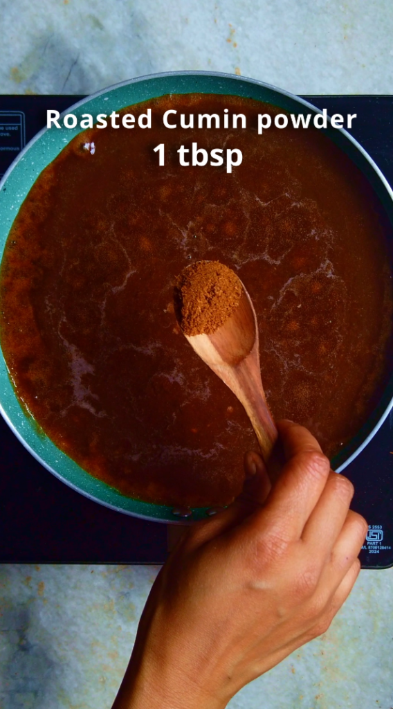 - Step 3: In a pan combine strained tamarind-date paste, ginger powder, cumin powder, salt, black salt, chili powder and jaggery, stir to combine.