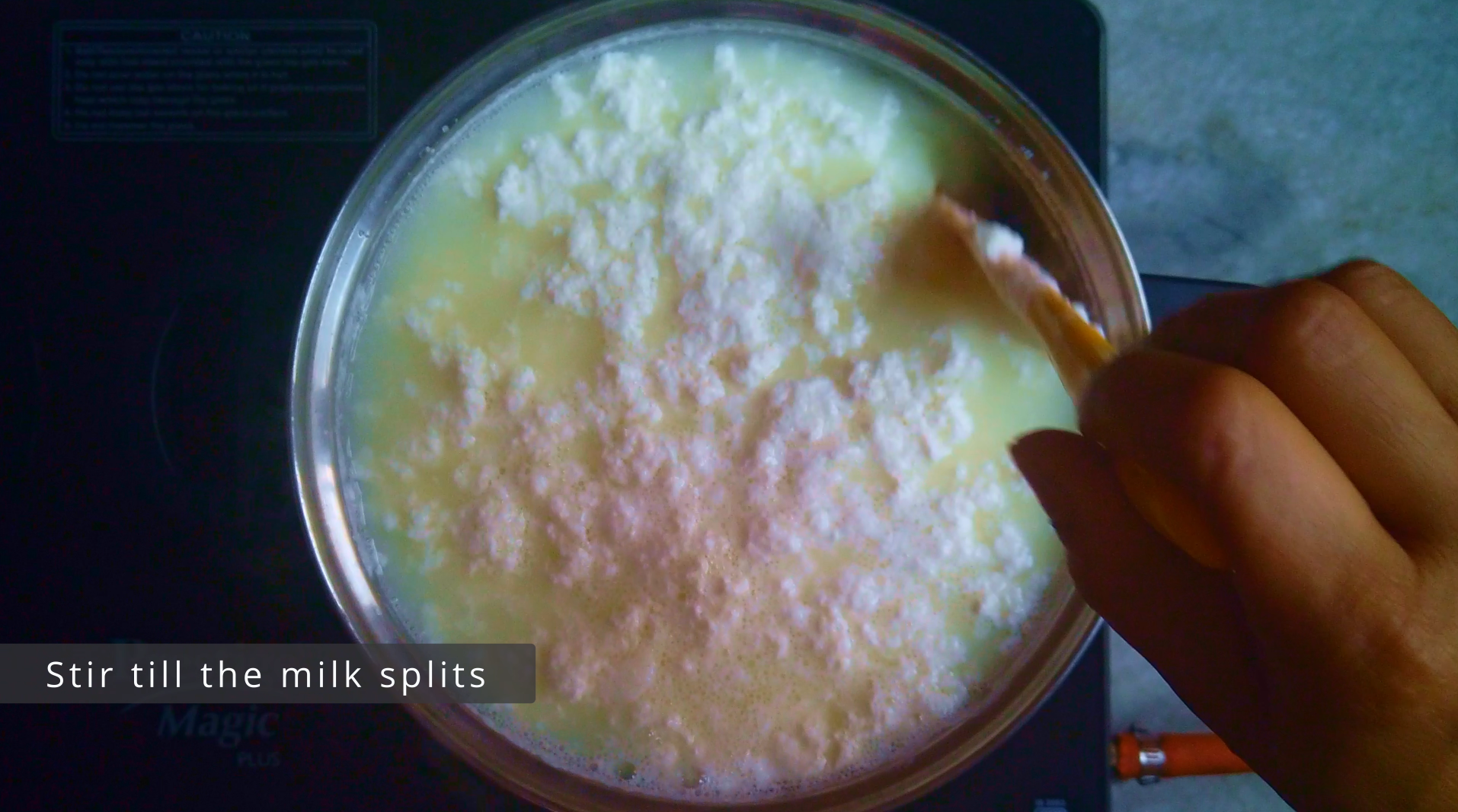 • Step 1: In a bowl combine vinegar and water. Bring the milk to a boil on low heat. Add curd and vinegar solution and stir till the milk splits. When the milk curdles, turn off the heat.